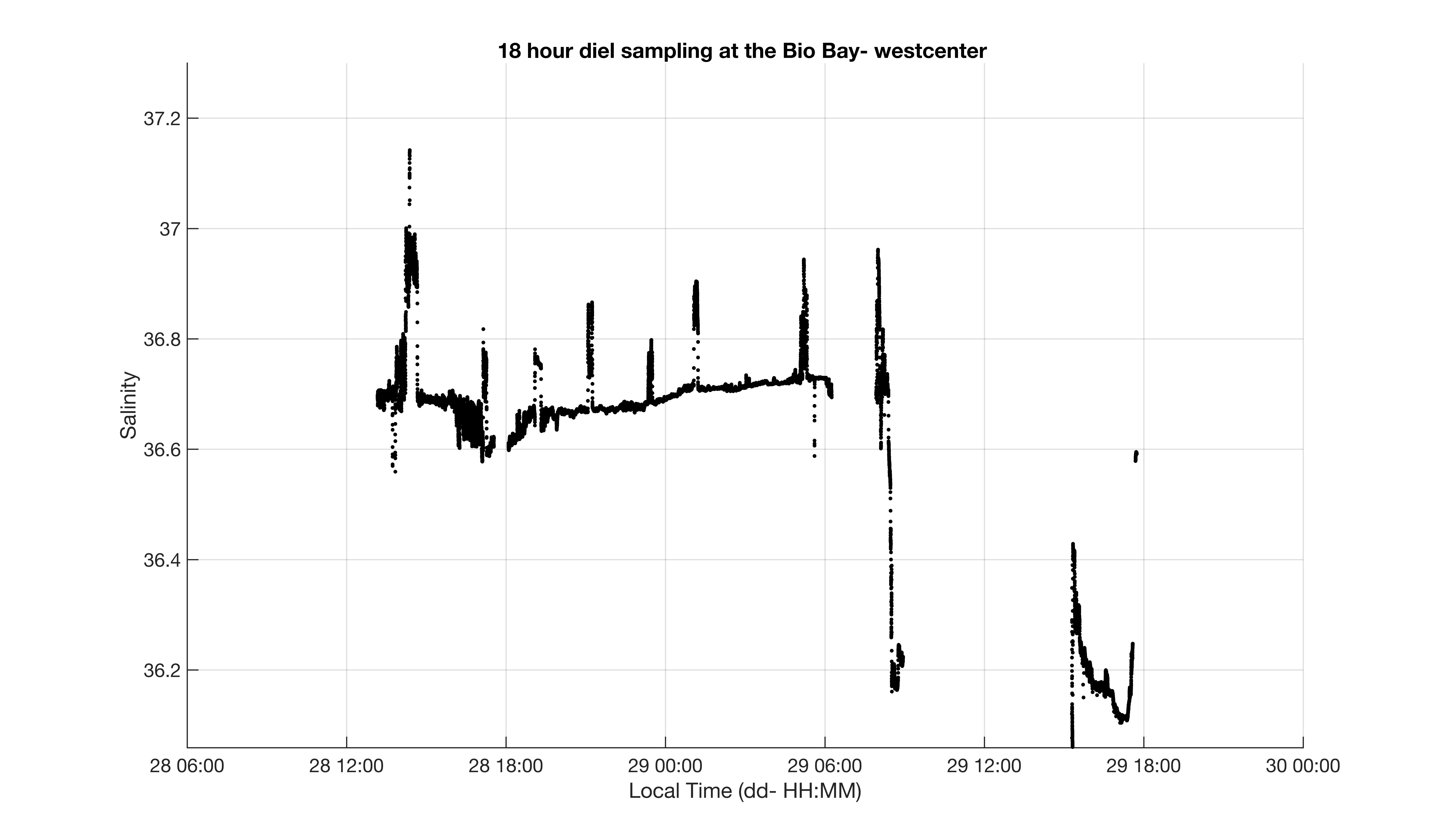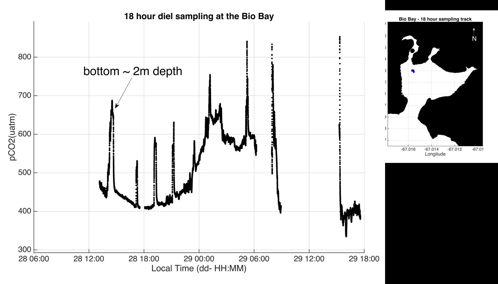 Part of the second day incorporated an 18-hour diel sampling at the west center of the Bio Bay to investigate the relative influence of community metabolic processes at diurnal time scales. During the day surface seawater pCO2 concentrations are close to atmospheric equilibrium (~400 uatm). However, there is an apparent salinity stratification (Figure 4), where the pCO2 levels at the bottom are ~200 uatm higher compared with the surface water (Figure 5).