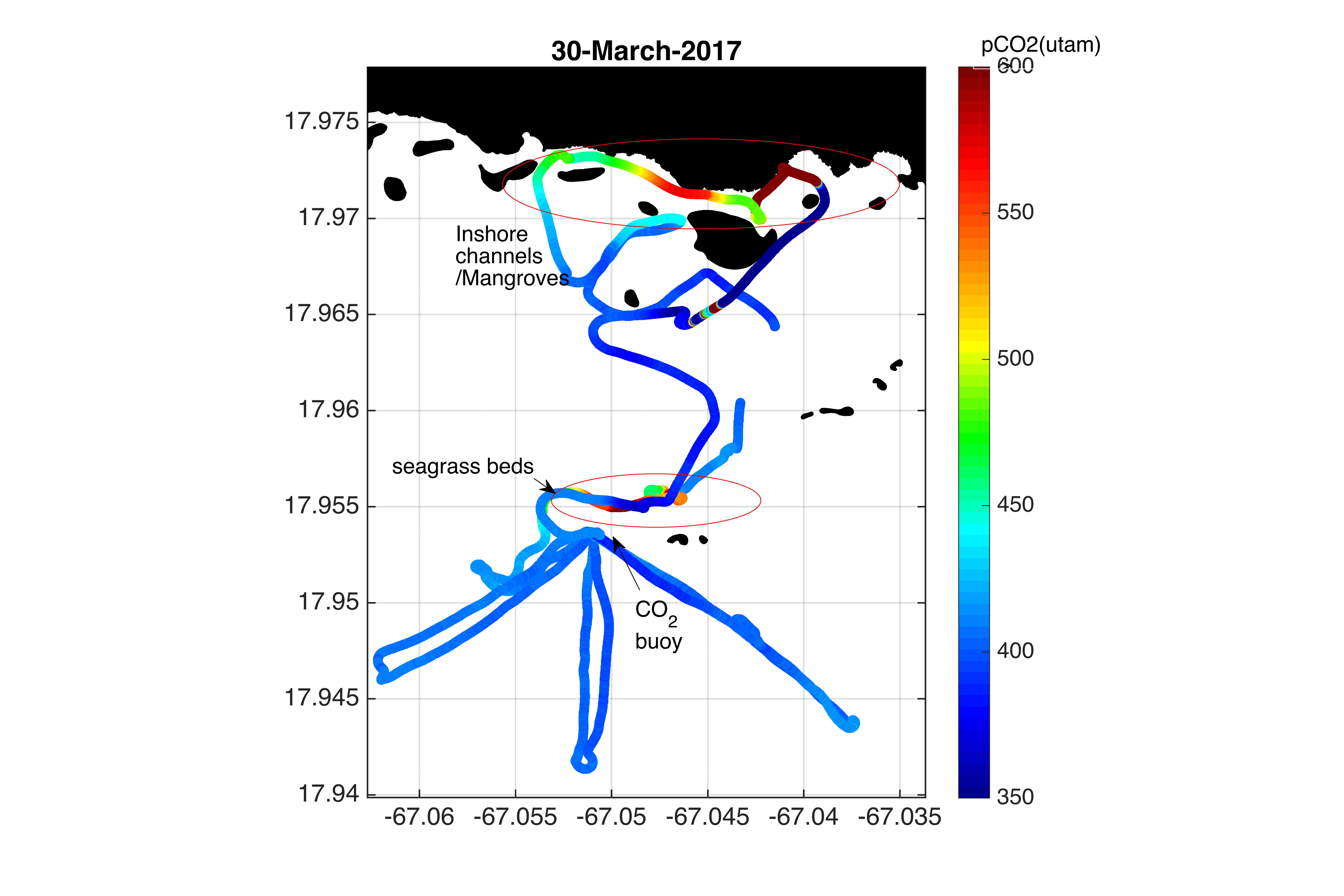 3. Develop spatio-temporal maps of carbonate parameters (pH, DIC, TA, pCO2) for La Parguera coastal barrier system. The spatial mapping tool for presenting the results will be based on potential regulatory parameters such as pH, CO2 and Ω. This is currently in progress.