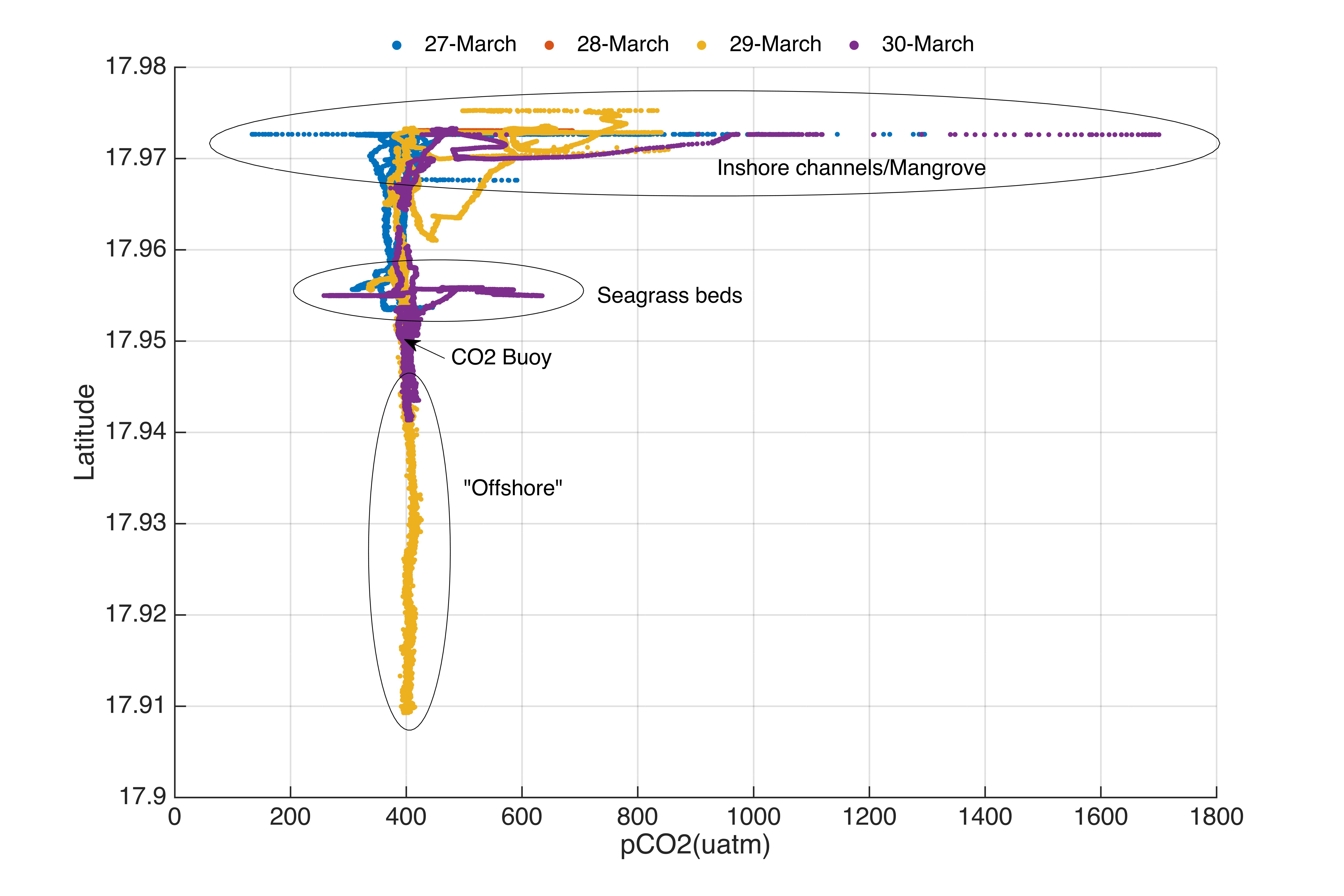 Preliminary results indicated that areas particularly sensitive to ocean acidification are the Bio Bay and inshore channels (Figure 2) The results show that pCO2 concentrations in the inshore waters reached levels close to 1,000 uatm, which is significantly higher than the pCO2 of ~650 uatm projected for 2030 as the threshold value for tropical coral reefs (Yates & Halley, 2006). Results show the capacity of mangroves and seagrasses to modulate chemical and physical conditions of their environment (Figure 3). Results show that the mangrove and seagrass areas carbon system is more dynamic and complex than the “offshore” and reef waters (Figure 3).