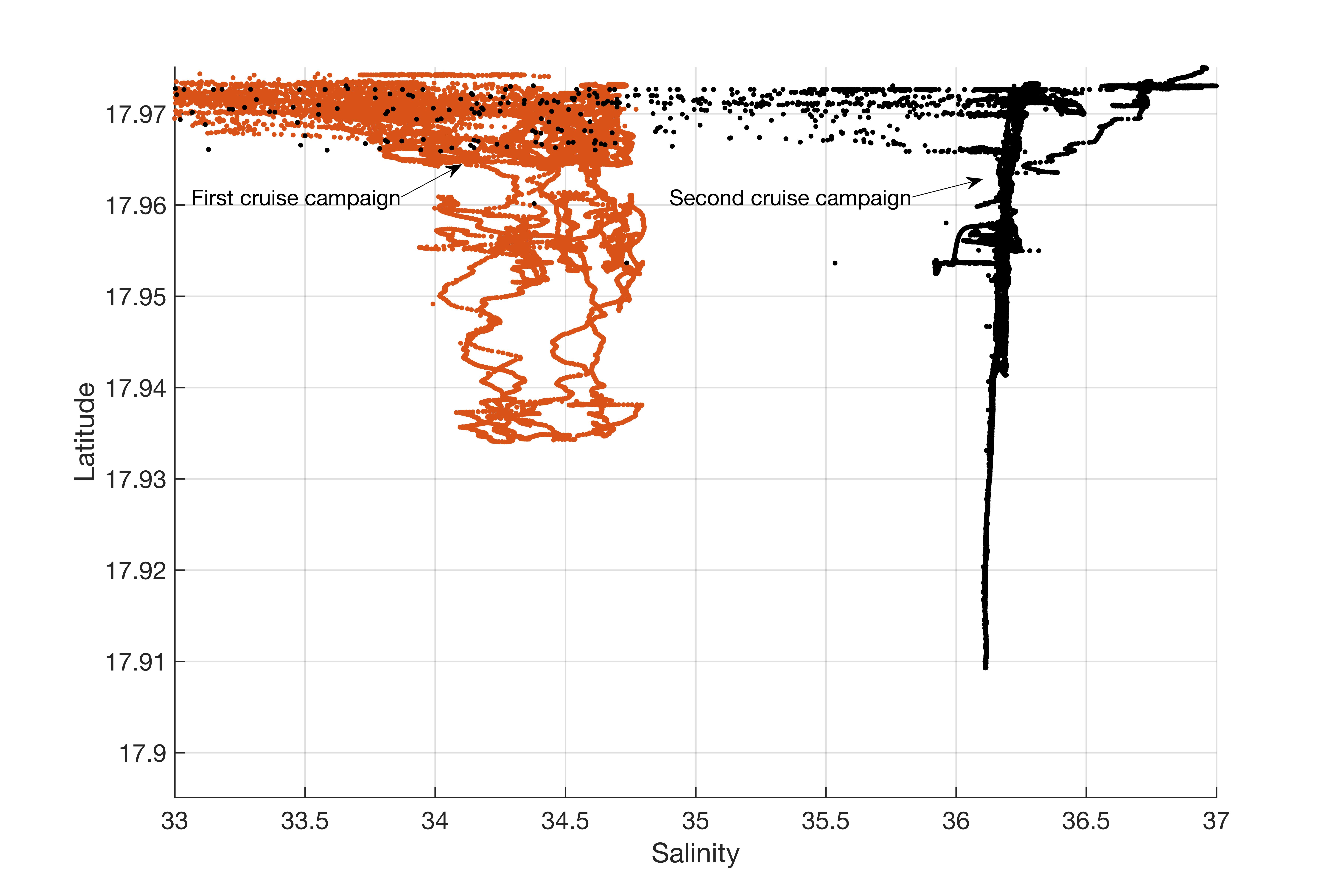 Figure 6: Salinity comparison between the two cruise campaigns. The orange dots show the November 2016 cruise sampling and the black dots the second cruise sampling on March 2017