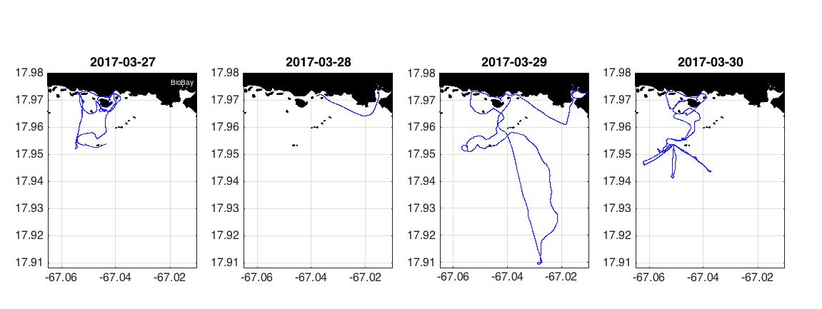 A second research cruise has been conducted along the coast of the Marine Reserve of La Parguera, Lajas, Puerto Rico to assess the spatially and diurnal variability of the seawater carbonate chemistry. The cruise was conducted from the 27th to 31st of March of 2017 (Figure 1). Part of the cruise incorporated a series of 3 transects and an 18-hour diel sampling at the center of the Bio Bay (Figure 1). Fifty-seven (57) discrete seawater samples for total alkalinity (TA), dissolved inorganic carbon (DIC) and pH were taken on specific locations. Underway measurements for salinity, temperature, dissolved oxygen, dioxide carbon (pCO2, air and water), light attenuation, chlorophyll, and colored dissolved organic matter were collected using a flowthru system.