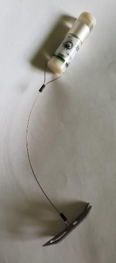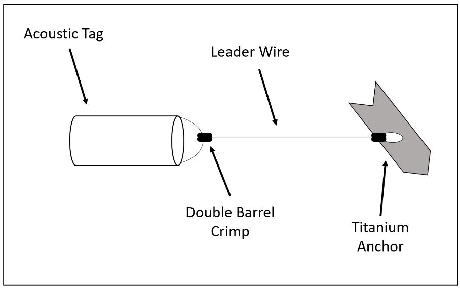 Figure 2.3 Telemetry tag picture along with labeled design comprised of the anchor, leader wire, crimps and acoustic tag...........................................................................68
