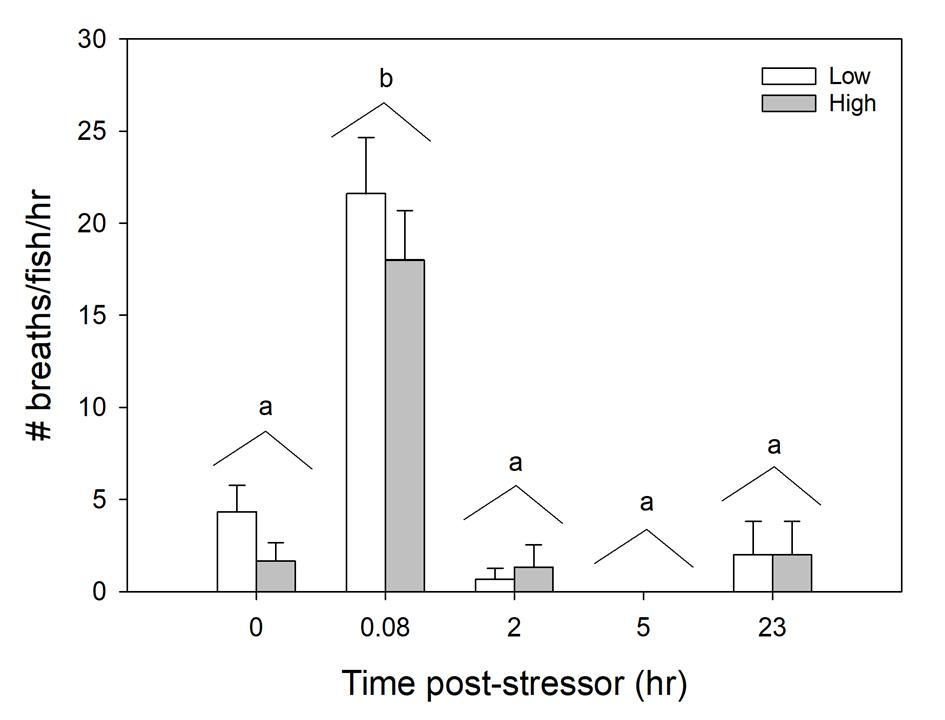 Figure 1.15 Air breathing counts over a 5-minute time period for various time trials before and after inducing stress of laboratory fish (n=60).........................................36