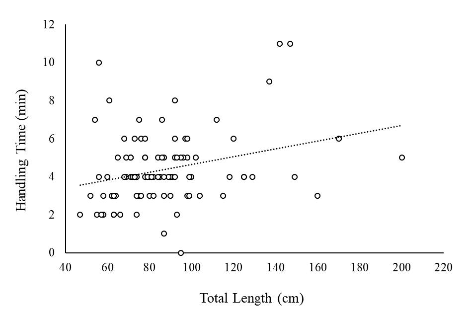 Dots represent individual fish with a trend line of Total Length = 0.021(Handling Time) -2.613. The adjusted R2 = 0.083, p < 0.0001
