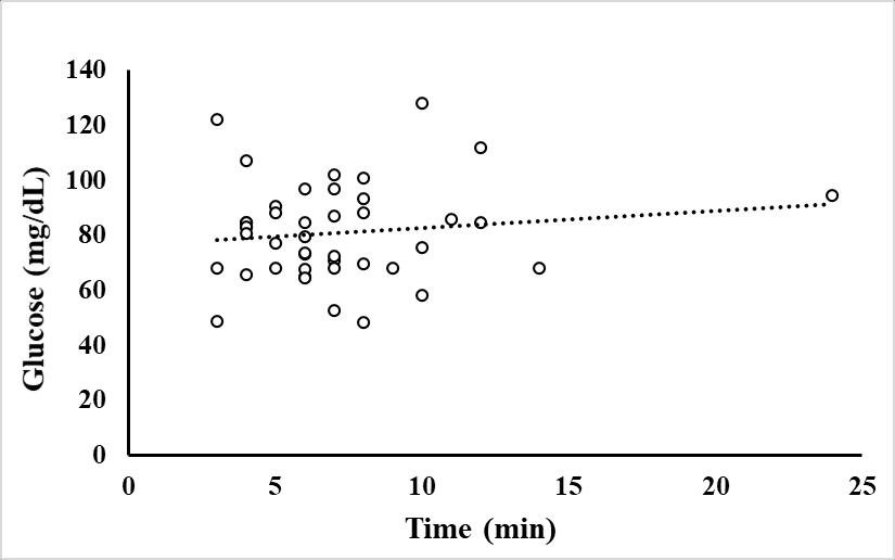 Figure 1.4 Glucose concentration (mg/dL) of simulated angled fish in laboratory settings (n=67) in combined trial runs over a 24 hour time period. ........................................25
