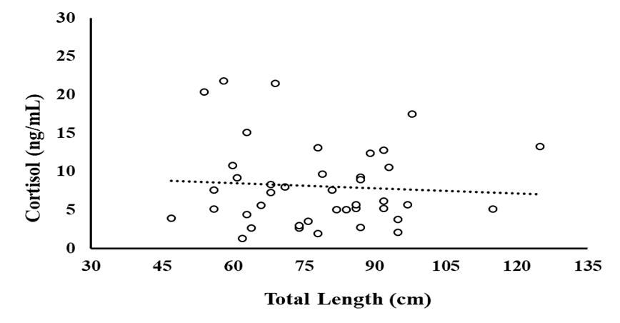 Figure 1.2 Cortisol concentration (ng/mL) of wild-caught fish (n=42) as a function of total length (cm). ........................................................................................................23