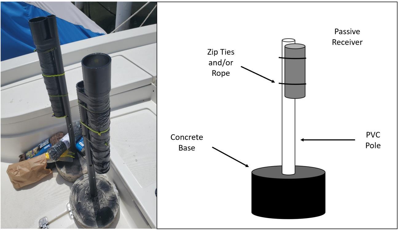 Figure 2.6 Passive receiver deployment picture along with labeled design comprised of PVC pole, receiver, rope and concrete stand.