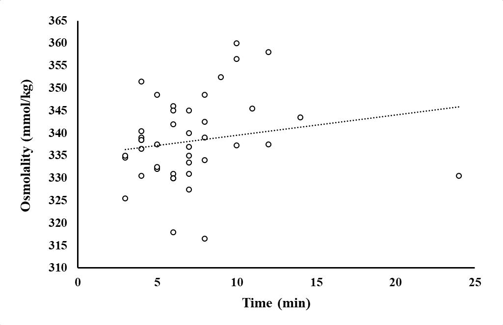 Figure 1.12 Osmolality (Osmol/kg) of wild-caught fish (n=43) as a function of fishing time as the total fishing experience (being caught and handled).