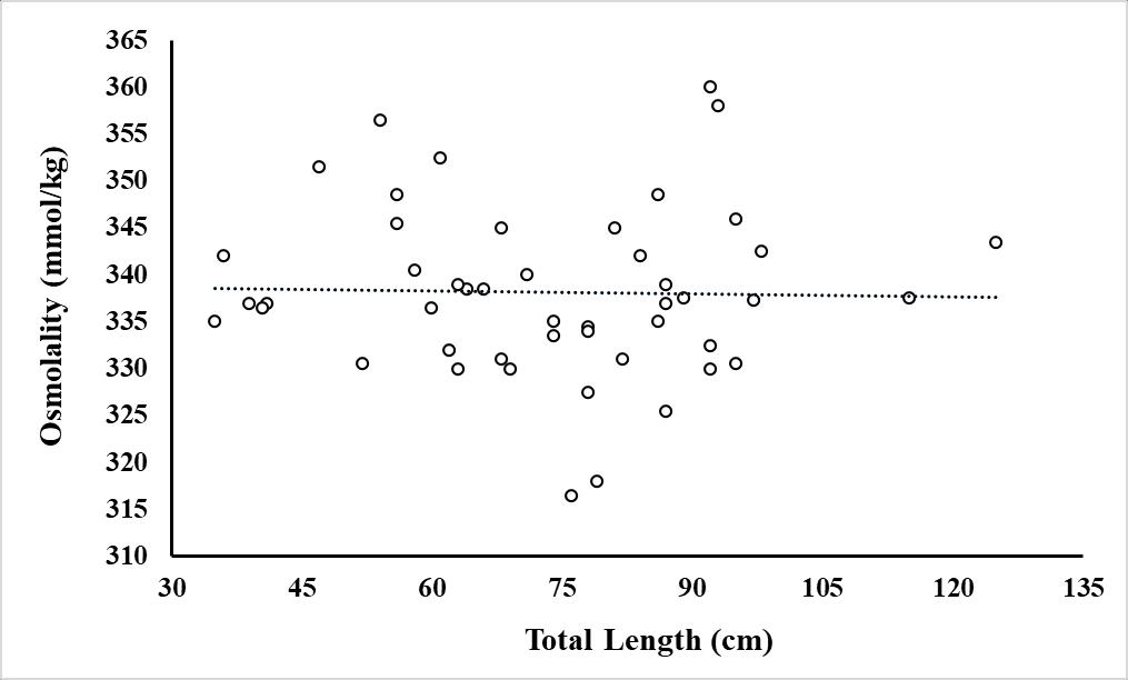Figure 1.11 Osmolality (mmol/kg) of wild-caught fish (n=43) as a function of total length of the fish in cm.