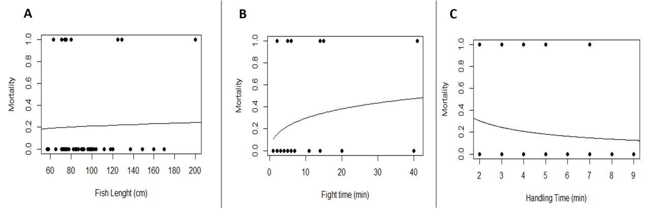 Figure 2.15 Predicted probability of mortality of tarpon in response to (a) body size (total length) (b) fish time (time the fish was on the line) (c) handling time (time the fish was out of the water) length.