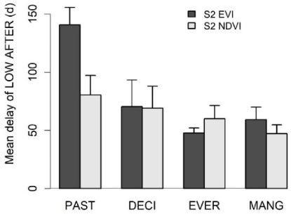ThetimingofLOWAFTERasthenumber ofdaysafterMariaindicatesperiodofdying-out ofleavesandbearstheinformationaboutduration ofhurricane-inducedstresses(figure 6).Duetothe largevariationwithinvegetationgroups,wedidnot findsignificantdifferenceinthemeantimingamong groups.TheaverageddelayofLOWAFTERis53.3 (11/12/2017),53.9(11/13/2017),69.8(11/29/2017), and110.7(1/9/2018)daysformangroves,evergreen forests,deciduousforests,andpastures,respectively. Themuchlongerdelaysforthelattertwomayrelateto post-hurricanedroughtandonsetofdryseasonstartinginlateDecember.EVIismoresensitivetochanges ingreennessforhighleafbiomass,andismore suitablefortropicsthanNDVI(Huete etal 2002). ThedelaysdetectedbyEVIshowedstrongercontrastamongvegetationgroupsthanthosebyNDVI (figure 6).Thelongestdelay,140.8d(2/8/2018),for pasturesshowsthattheimpactonthelowerprofile herbaceousismostlycausedbythedroughts.The shortestdelayof47.9d(11/7/2017)forevergreen forestsand11daysmore(11/18/2017)formangroves