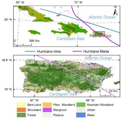 Figure1. LocationofPuertoRicointheCaribbean(top) andlandcoverin2010(bottom).HurricaneIrma(blue line)passedtothenortheastonSeptember6,2017while HurricaneMaria(purpleline)madealandfalland traversedtheislandfromsoutheasttonorthweston September20,2017.