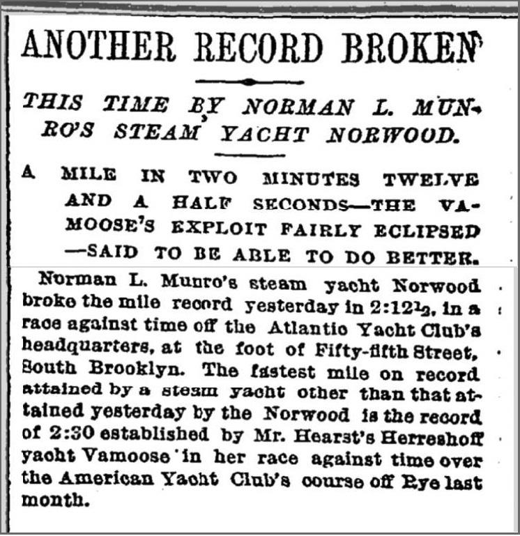 Stiletto’s design and speed considerably upped the game in the development of steam yachts for wealthy folks who lived on Long Island but worked in New York City. It wasn’t quite like winning the Blue Riband, but the august New York Times frequently reported on the results of their races and fast passages. Norwood, built for pub -