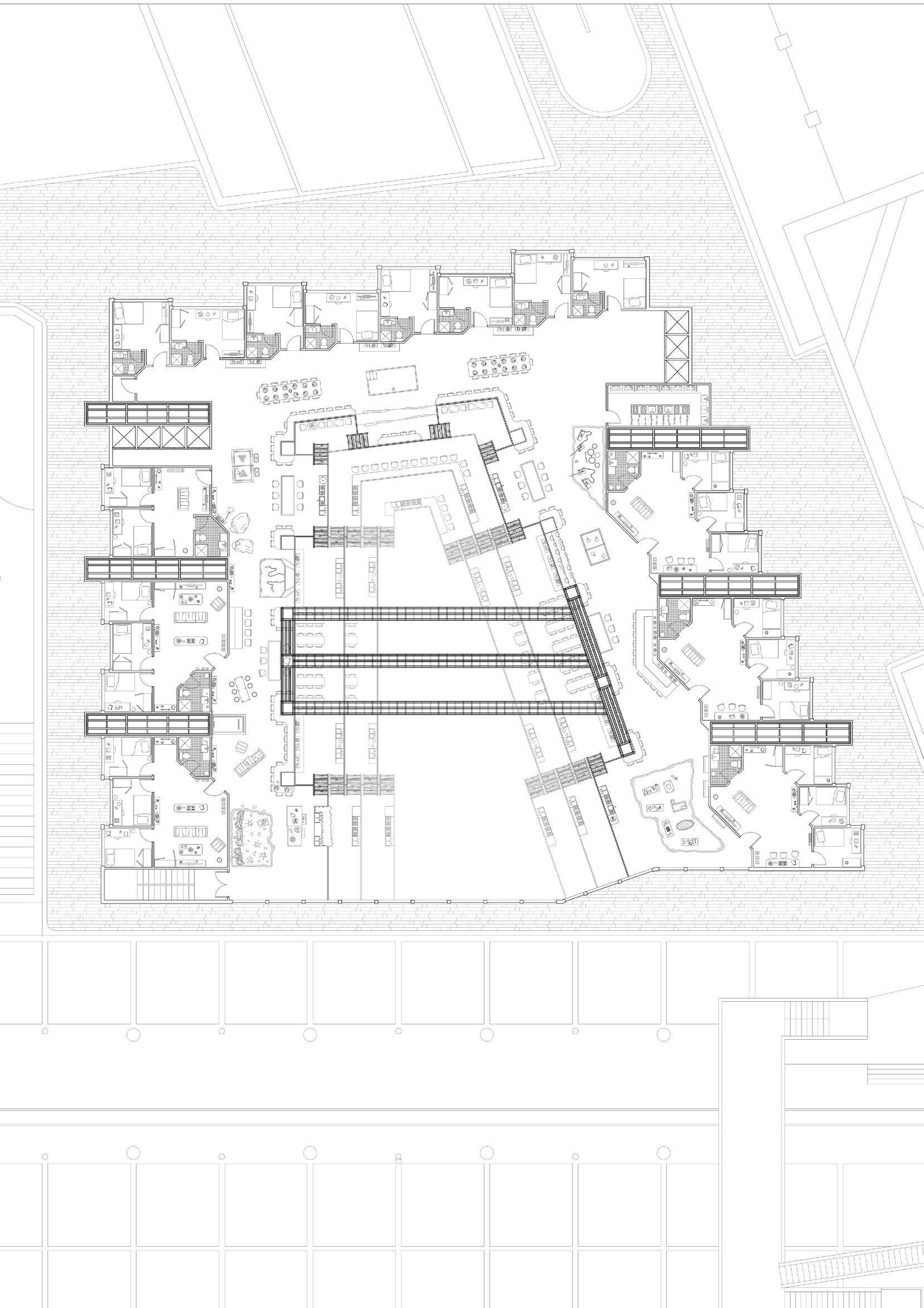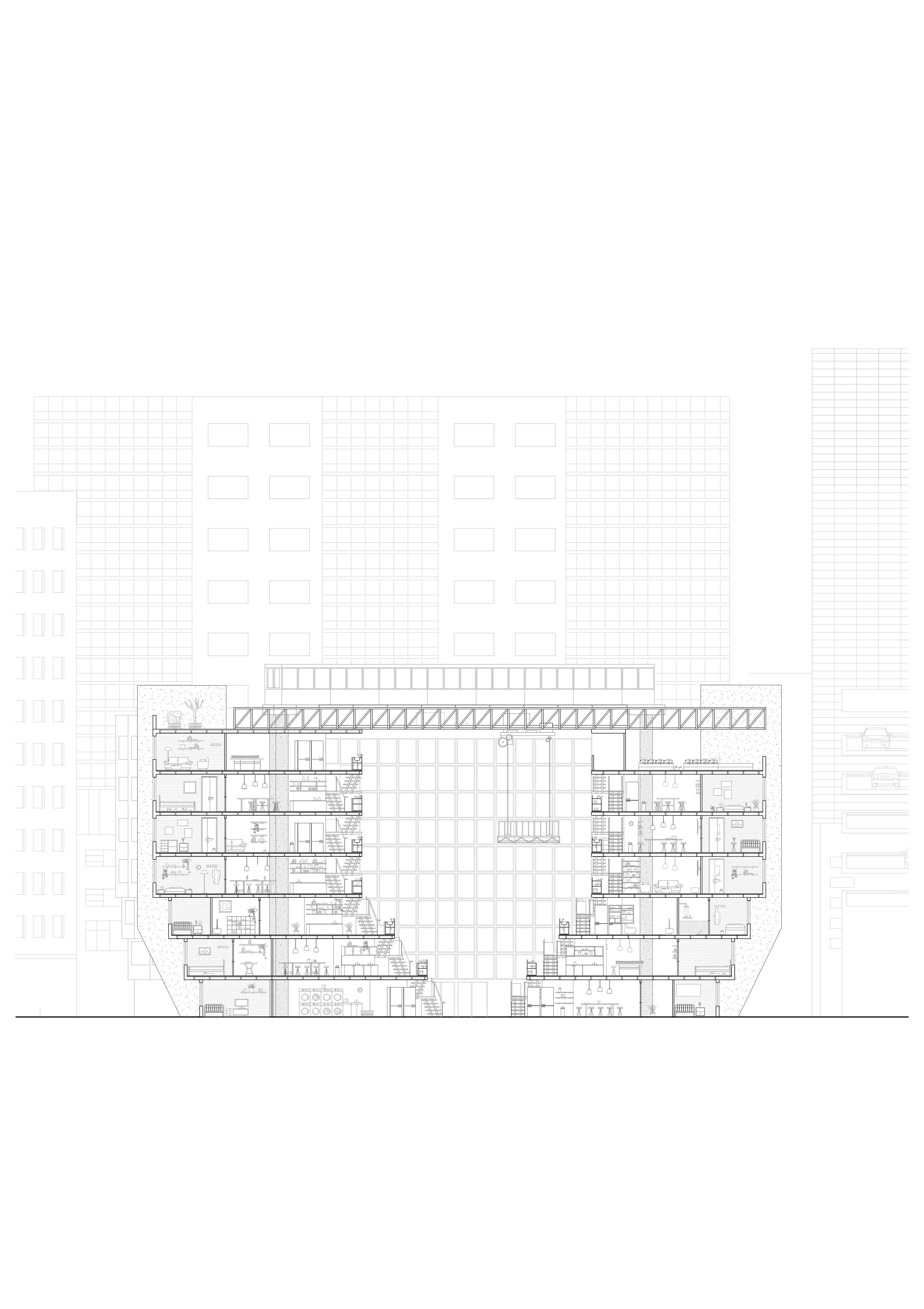 Establishing a clear separation between the community and the institution, harbouring more communal modes of living where self-sufficiency and interaction are at the forefront. Wherein private rooms take on an auxiliary role to the communal central atrium, where all of the occupants’ actions of recreation, productivity, and expression take place, in which both individual and cooperative productivity take priority over conventional notions of personal life such as luxury and order. Creating a performance and stage whose audience and actors celebrate themselves.