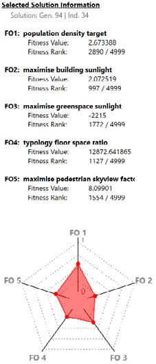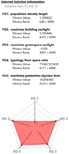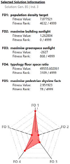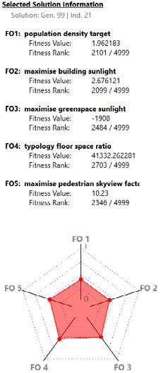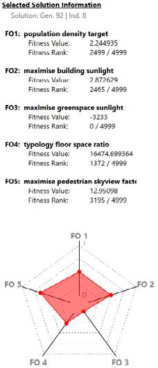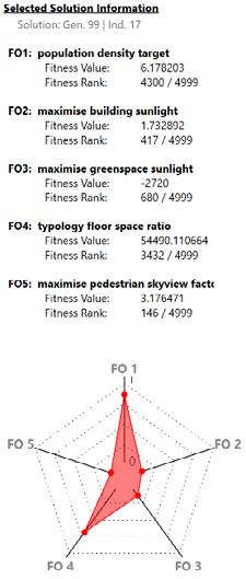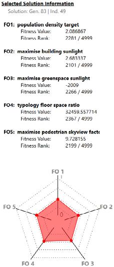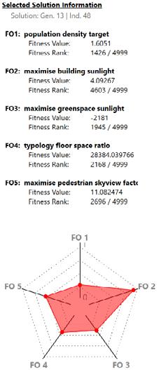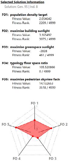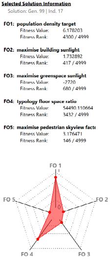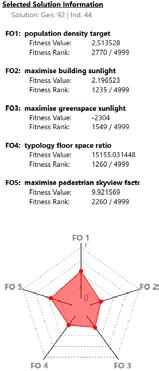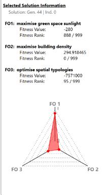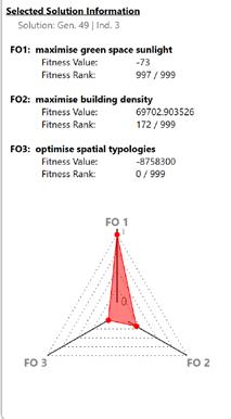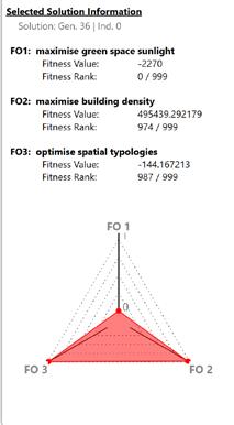 For this project the chosen solution was the one with the highest average performance across the 3 objectives. Despite this average ranking, the solution still favoured the building centric objectives of increasing denisty and achieving typology ratios. However, the poor performance in the green space objective is exagerated by the existance of outlier solutions as previously shown.