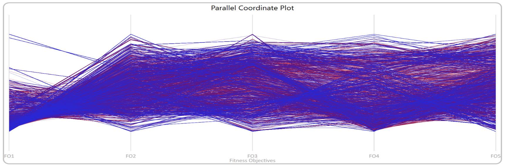 From the 5000 results, analysis for selection involves a multi step process. The first of which is analysing the data in numerical terms as seen in the charts above. From this data we can see that while results converged towards more optimal models as the simulation continued, variation between these results also increased. This data tells us that vastly different configurations were capable of achieving high levels of optimisation [20] Parallel Coordinate Plot