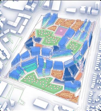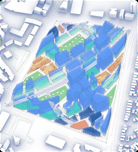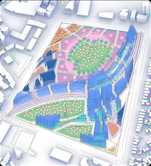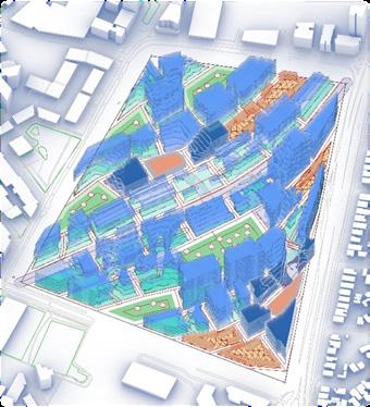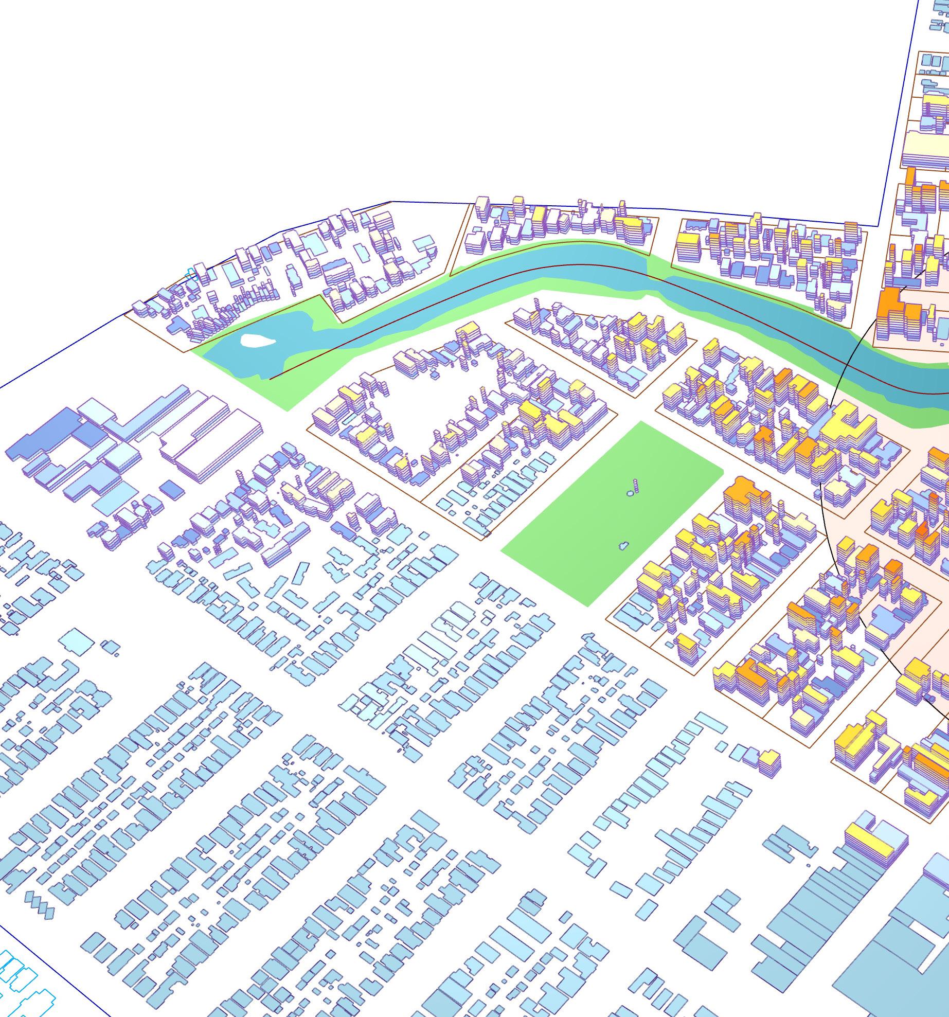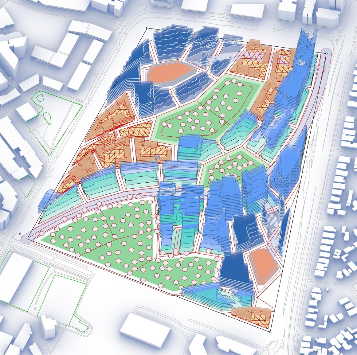 Data is linked to paramater controls to change building densities and establish new green spaces as per the design objectives
