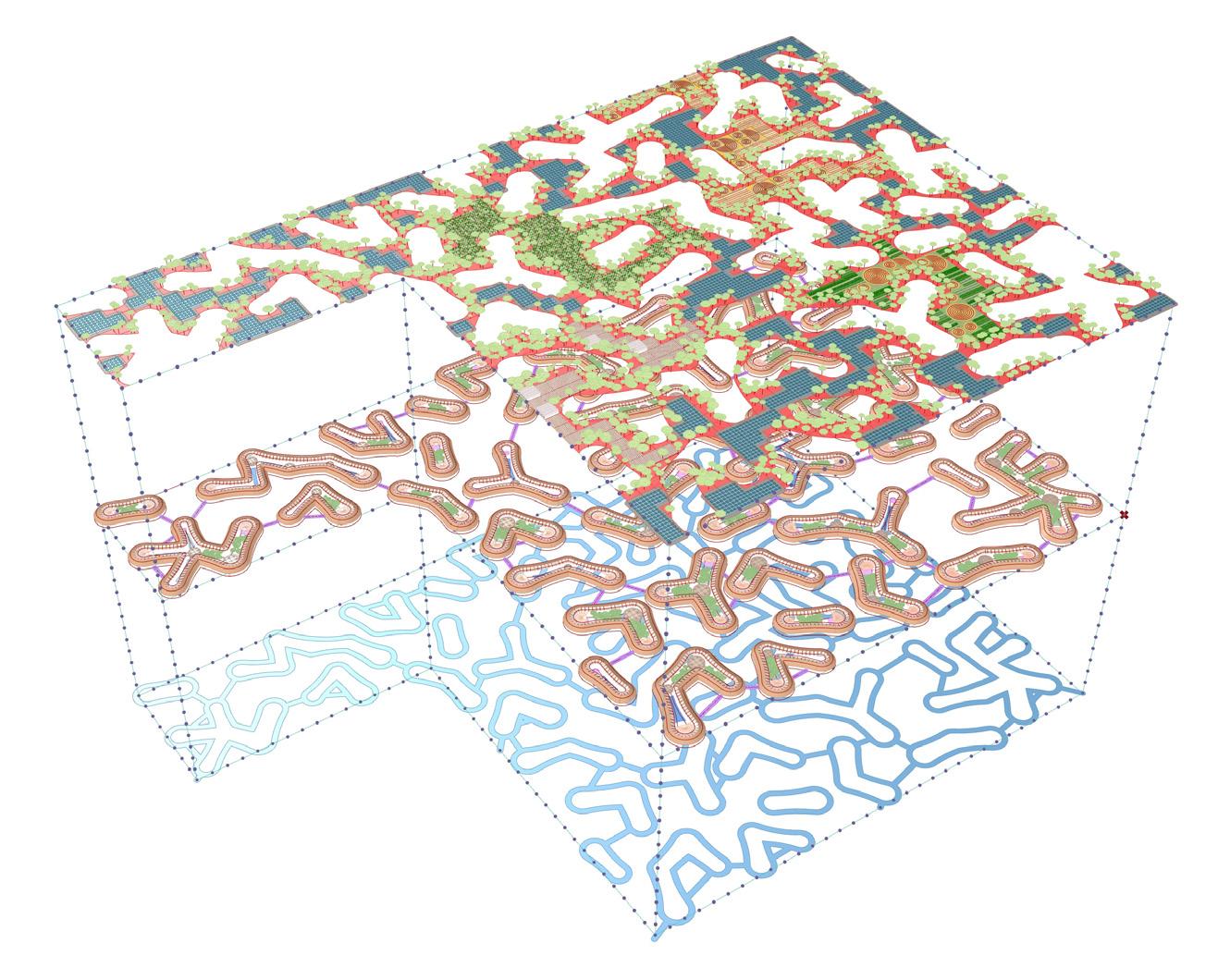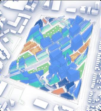 The foundational objectives of the algorithm being: 3 x current population target of 37 500; increased sun exposure on residential and green spaces; and optimised spatial typology distribution to accomodate different living situations, inviting more varied family and cultural dynamics to exist in the suburb.