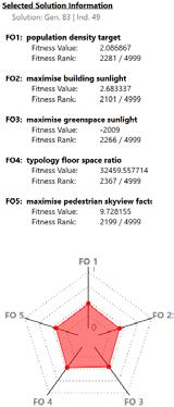 The evolutionary engine parametrically controls the shape of the main avenue, building heights, and the depth and angle of street divisions. Instating different slider values to achieve optimal results between the five fitness objectives.
