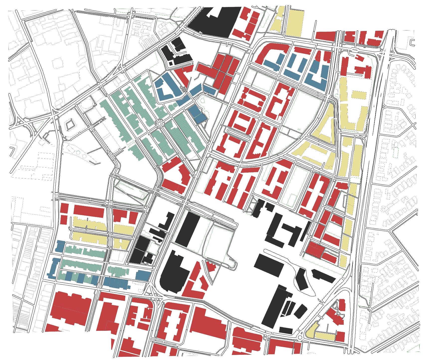 largest plots on each suburb half + the size of the half’s. Second, mixed use residential plots (Blue) are defined on plots borestablished from the remaining plots determined by cluster size. Fourth, commercial spaces (yellow) populate remaining plots.