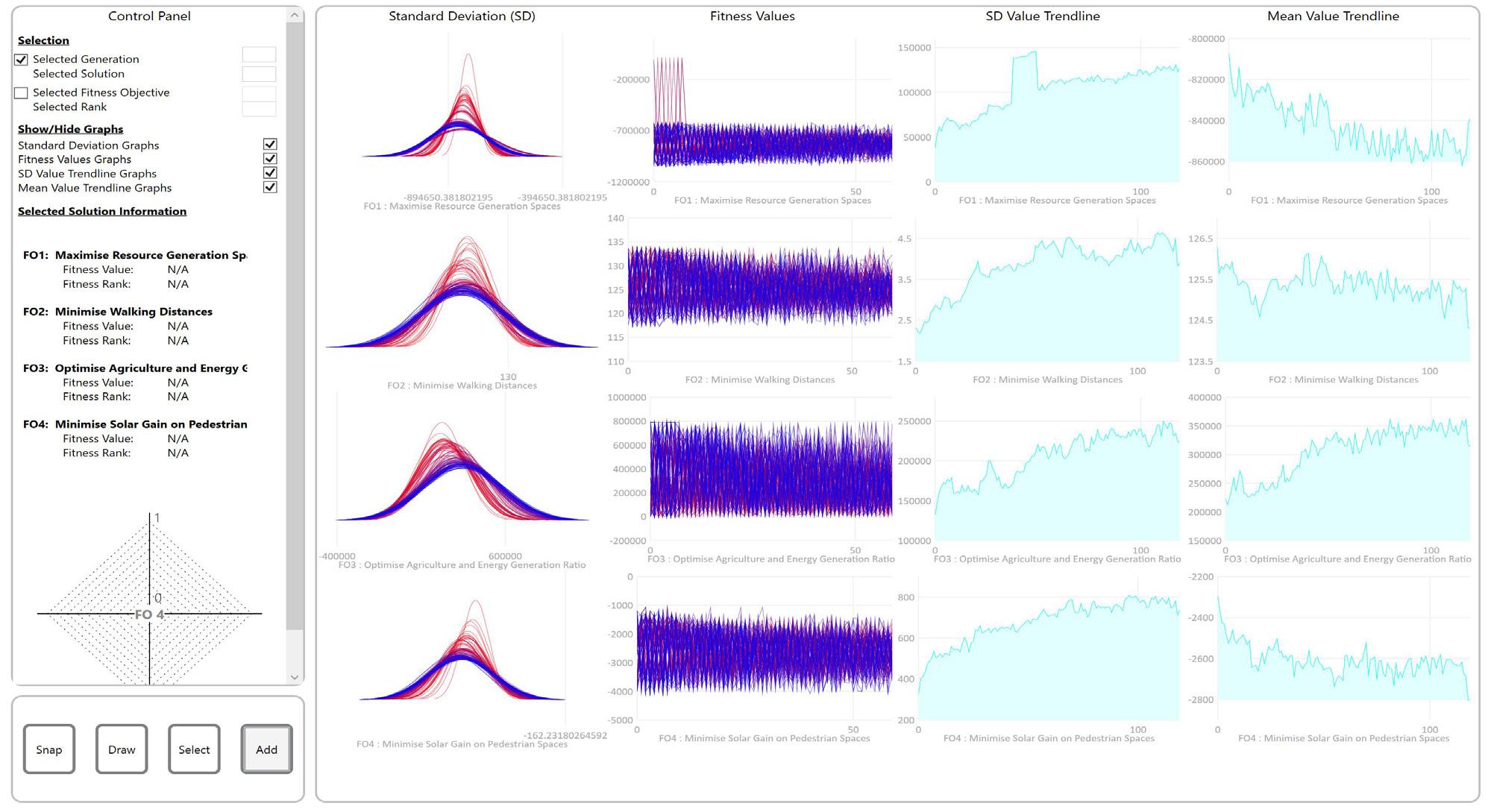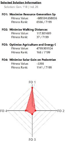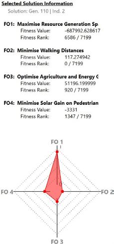 [12] Wallacei Analysis: The algoirthm runs a 4 objective simulation to {1} maximise resource generation spaces, {2} minimise walking distances {3} optimise resource generation {4} minimise solar gain on pedestrian spaces