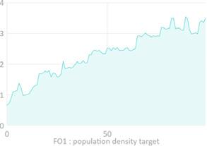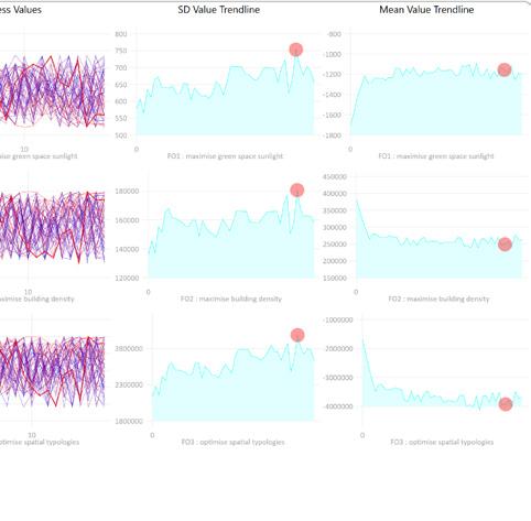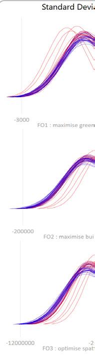 This chart displays the performace of each objective as the simulation progresses as well as the realtionship between different objectives. From analysing the chart we see that the perfomance of Objective 1 (maximising green spaces) was in direct conflict with the other objectives, which were close to 1 : 1 in terms of mutual performance.