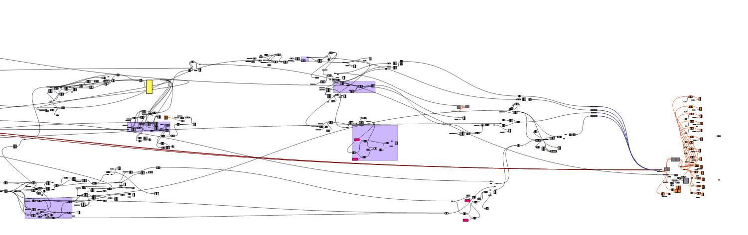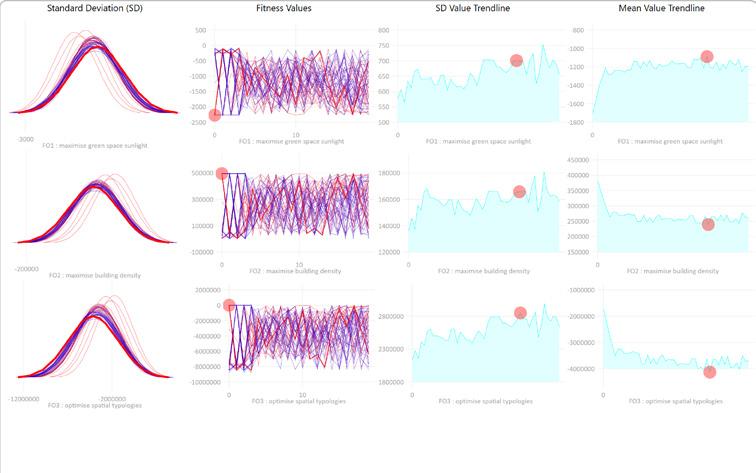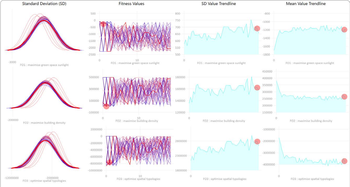 The engine repeated simulations for a result pool of 5000. Built from 50 individuals x 100 generations. Wherein a single generation’s individual results vary slightly in arrangement from precise adjustments of slider values, while progressive generations invoke more substantial adjustments, incorporating data of previous generation towards a more optimal result.