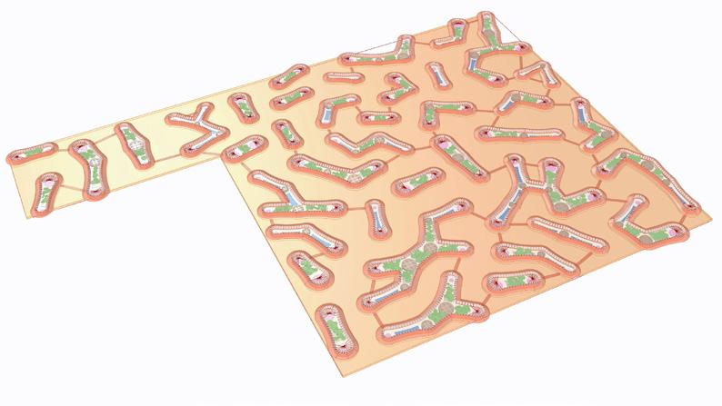 [23] Selected result - Individual 44 Generation 92: Comparing results from all phenotypic indicators, as well as an additional indicator measuring structural overhang, the highest performing individual from the 5000 results was found to be individual 44 of the 92nd generation. The individual featured a symmetrical curve avenue which allowed for green spaces along the avenue on the south side of the suburb, turning this half into largely open public space surrounding the Gunyama community center. While the north side saw a strong residential hub core and green space seperating 2 distinct commercial zones, defining this half as a more trade oriented side of Zetland.