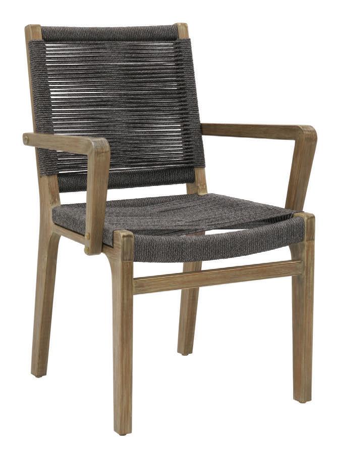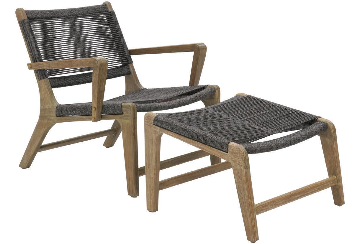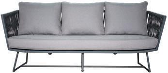 MATERIALS Dark Gray powder-coated aluminum frames, Dove Gray polypropylene rope weave, mixed-crushed QuickDry foam cushions with raincoat and Regency Miramar Super White zippered covers, Black nylon glides