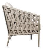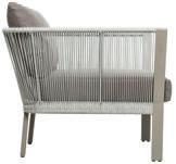 MATERIALS Light Gray powder-coated aluminum frame, Dove Gray polypropylene rope weave, nylon glides; regular foam seat cushion with raincoat, crushed QuickDry foam back pillows, Regency Taupe polyester zippered covers