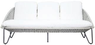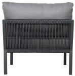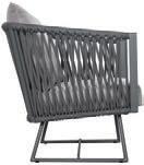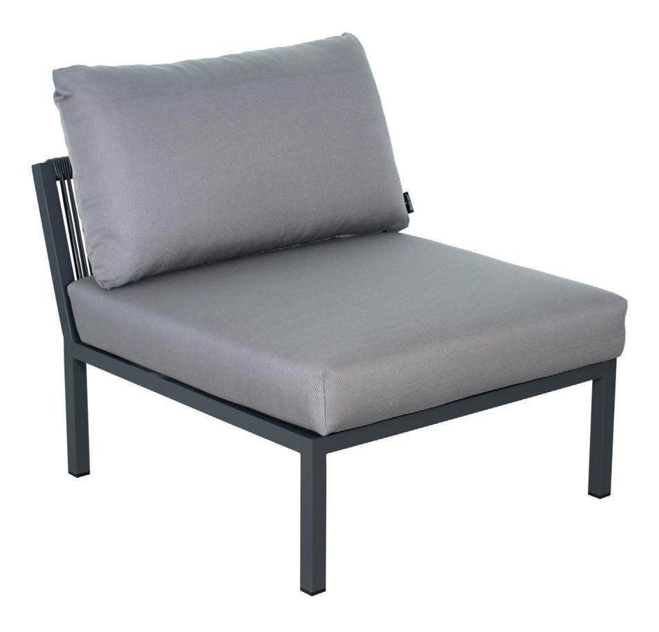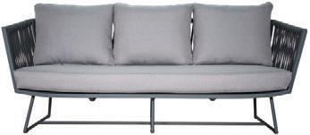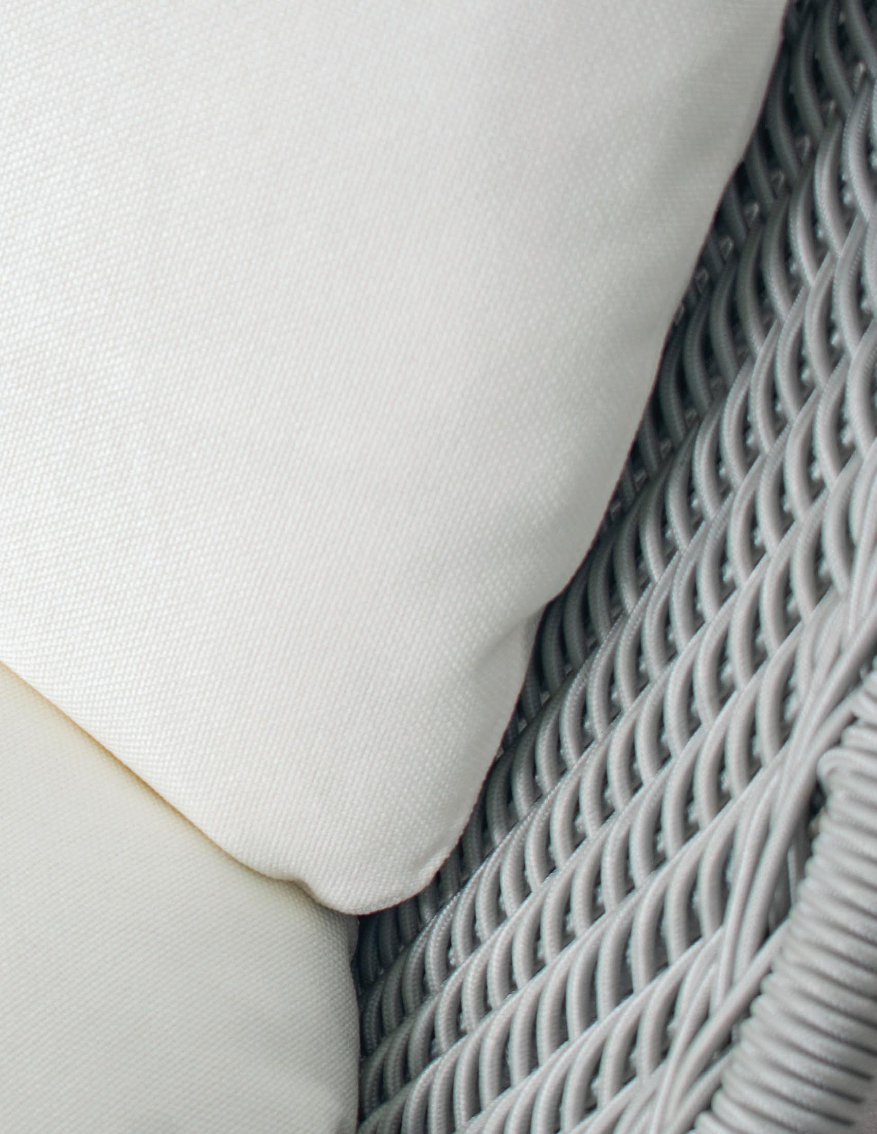 MATERIALS Dark Gray powder-coated aluminum frame, Dark Pebble polypropylene rope weave, latex seat webbing sealed in polyester resin with UV stabilizer, Black nylon glides; polyurethane foam seat cushion, crushed QDF back pillow with raincoat, Texsilk Semai S21 Gray zippered cushion and pillow covers