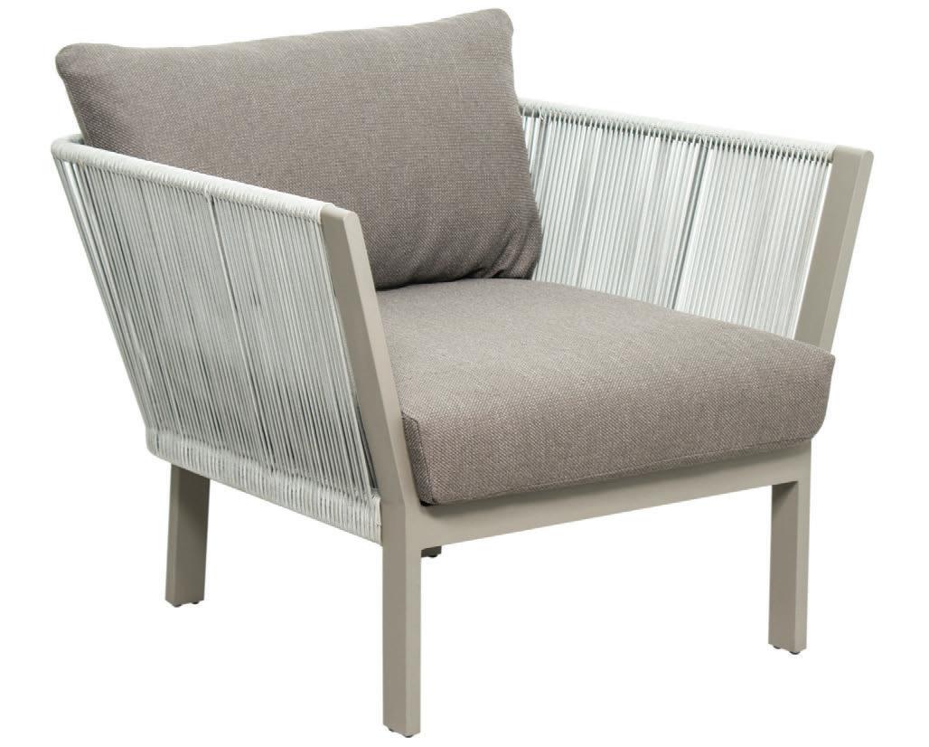 MATERIALS Light Gray powder-coated aluminum frame, Dove Gray polypropylene rope weave, nylon glides; regular foam seat cushion with raincoat, crushed QuickDry foam back pillow, Regency Taupe polyester zippered covers