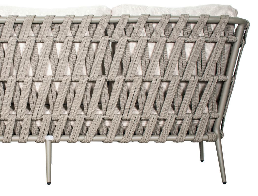 MATERIALS Dark Gray powder-coated aluminum frame, Cardamom Taupe polypropylene rope weave, nylon glides; regular foam seat cushions with raincoat, crushed QuickDry foam back pillows, Regency Taupe polyester zippered covers