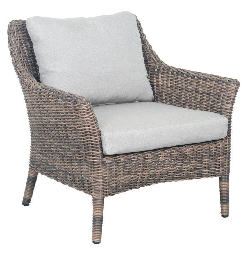 MATERIALS Light Gray powder-coated aluminum frame, Dove Gray polypropylene rope weave, nylon glides; regular foam seat cushions with raincoat, crushed QuickDry foam back pillows, Regency Taupe polyester zippered covers