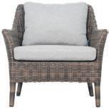 MATERIALS Light Gray powder-coated aluminum frame, Cardamom Taupe polypropylene rope weave, black nylon glides; regular foam seat cushion with raincoat, crushed QuickDry foam back pillow, Regency Carrion Collection Wheat polyester zippered covers