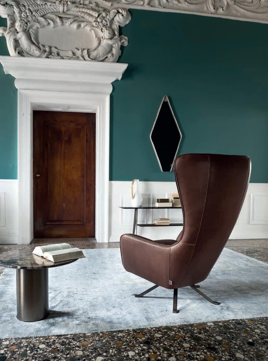 Designed by Gino Carollo, Vanity Fair is a different way of appreciating mirror design. The designer has opted for a rhomboid design to reflect discreet preciousness and beauty by contrasting materials like velvet and leather with the smoked glass element. Alone, paired, or even as a row of three, Vanity Fair is flexible in its use and approach to interior design.