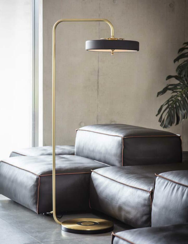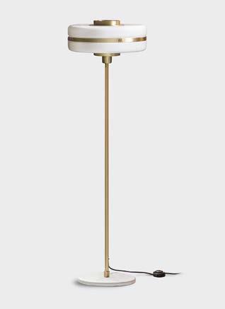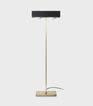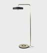 Riddle Floor Lamp Single: Size: H:1300mm W:520mm Base:250mm. 2m fabric covered flex supplied as standard with inline switch. 1 x G9 LED lamp Materials: Brass, Aluminium & Steel.