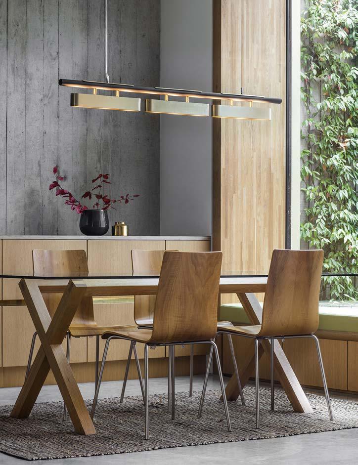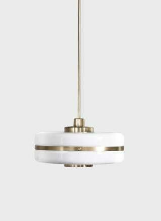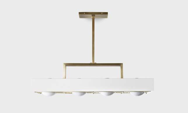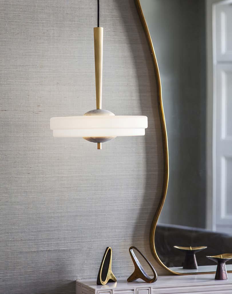 Casting a soft light both up to the ceiling and below, the striking long lines of Bert Frank’s Colt Pendant Light makes it the perfect design to hang above a dining table or kitchen island. Three machined brass grills encase opal diffusers for a sophisticated take on urban design.