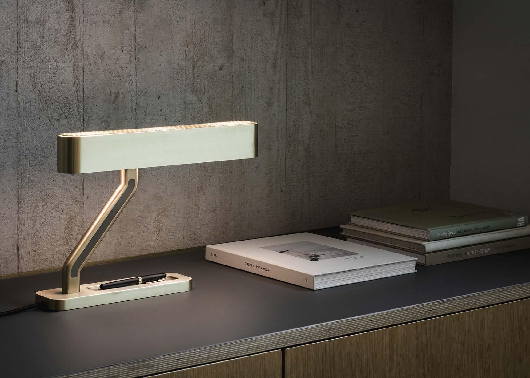 In the Shear floor lamp, strong graphic lines are created however you arrange the arms, the lights tilting their heads on perfectly balanced necks. Every joint and screw becomes a thing of delight when it’s lovingly machined from brass, then hand-brushed. The base of the Colt table lamp has a shallow tray machined into the solid brass base, to cradle your favourite pen.