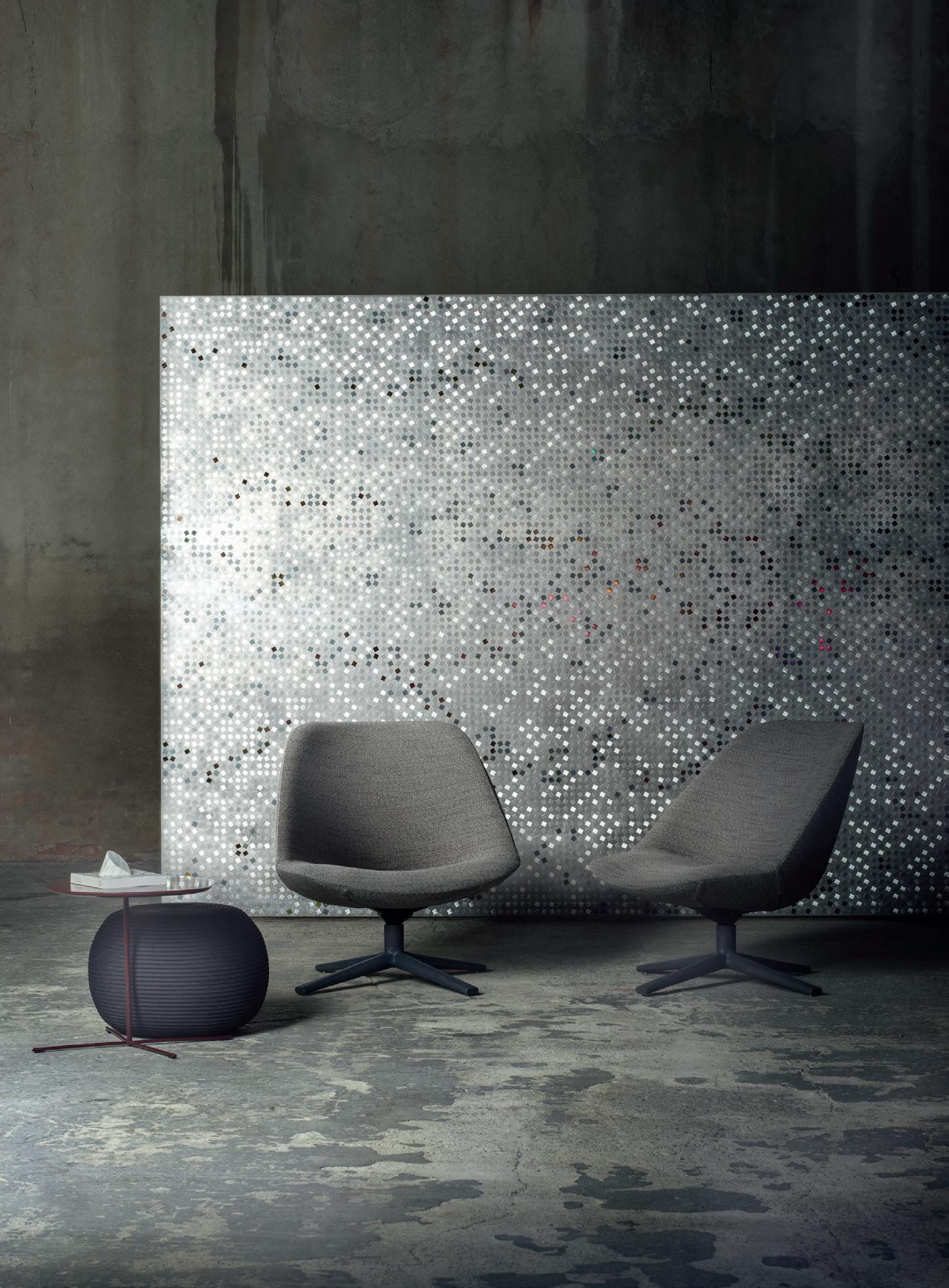 Glow è un rivestimento a mosaico per superfici verticali. Centinaia di piccole tessere di metalli differenti, trattate con i particolari processi di ossidazione De Castelli, vengono posate a mano una