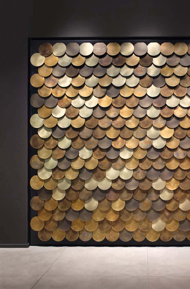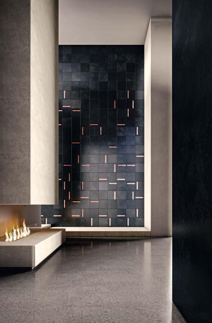 L’intensità poetica del metallo si dispiega in DeTile, DeMosaic e DeSign: tre mondi distinti concepiti per rispondere a diverse esigenze progettuali. Con DeTile la modularità delle soluzioni consente di intervenire anche sulla piccola scala puntando sulla qualità delle finiture e sul decorativismo di geometrie rigorose. In DeMosaic la suggestione dell’antica arte musiva entra nella dimensione architetturale e si esprime anche nelle grandi superfici. Grazie a produzioni su misura, DeSign svincola il progetto da limiti dimensionali al fine di offrire massima libertà compositiva.