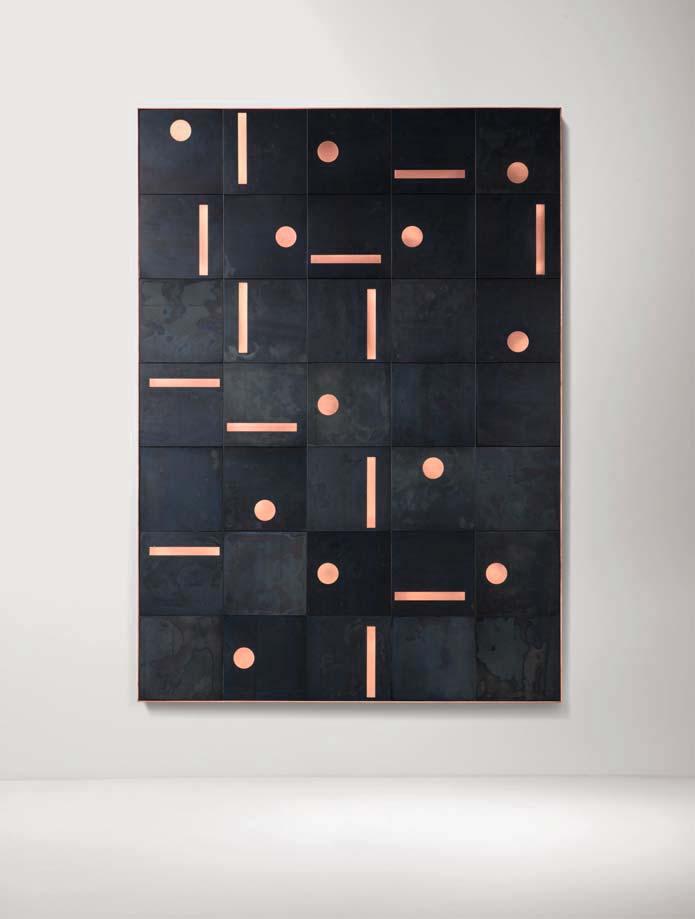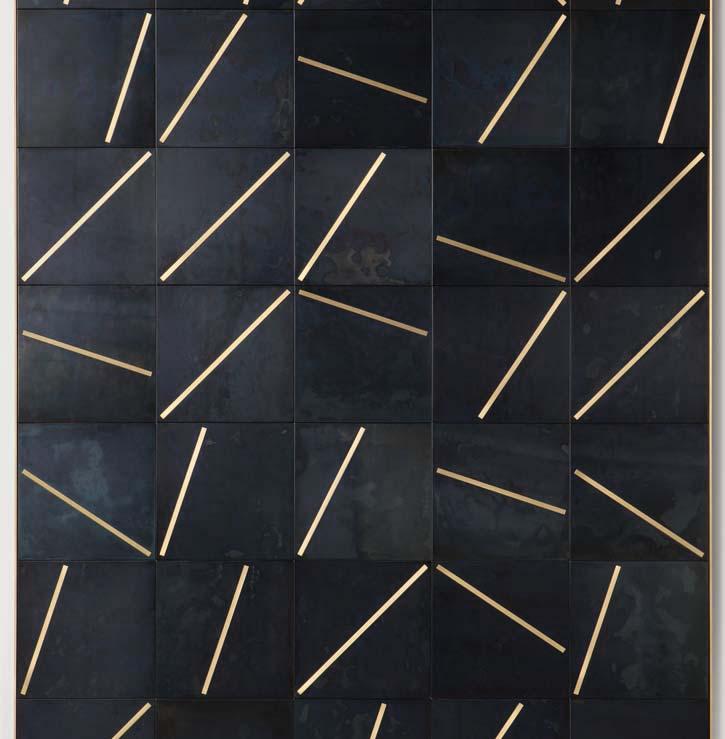 The graphic language that Leonardo Sonnoli harnesses to express De Castelli’s know how plays with a range of inlaid surfaces, where the precise angle of the ornamental inlays alludes to an aesthetic code of enigmatic symbolism. Yoko is a system of DeLabré natural black iron sheet metal modules with inserts in brass or brushed copper, which lends itself to random design as a method for creating unique and original compositions. Yoko combines graphic design and craftsmanship in a visual result of great elegance inspired by modern and contemporary art.