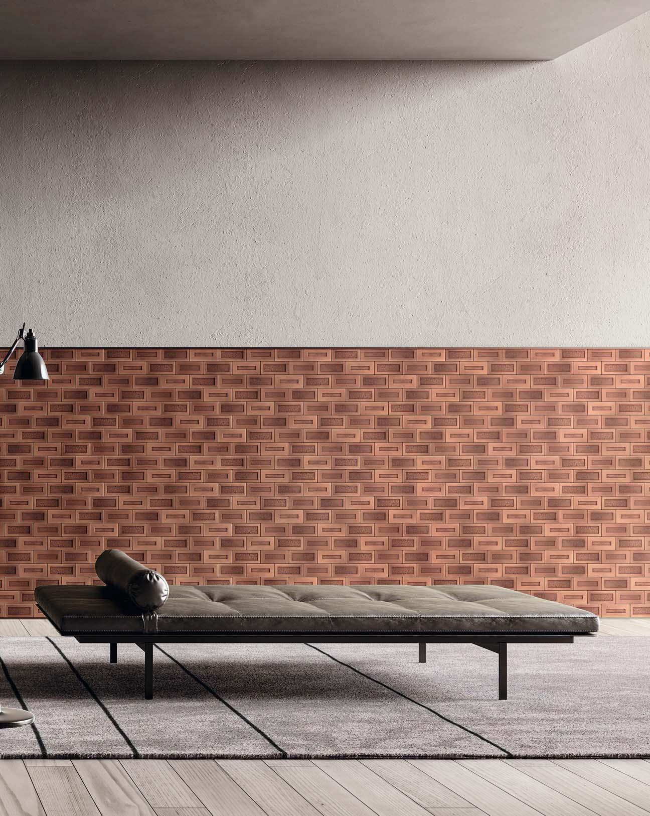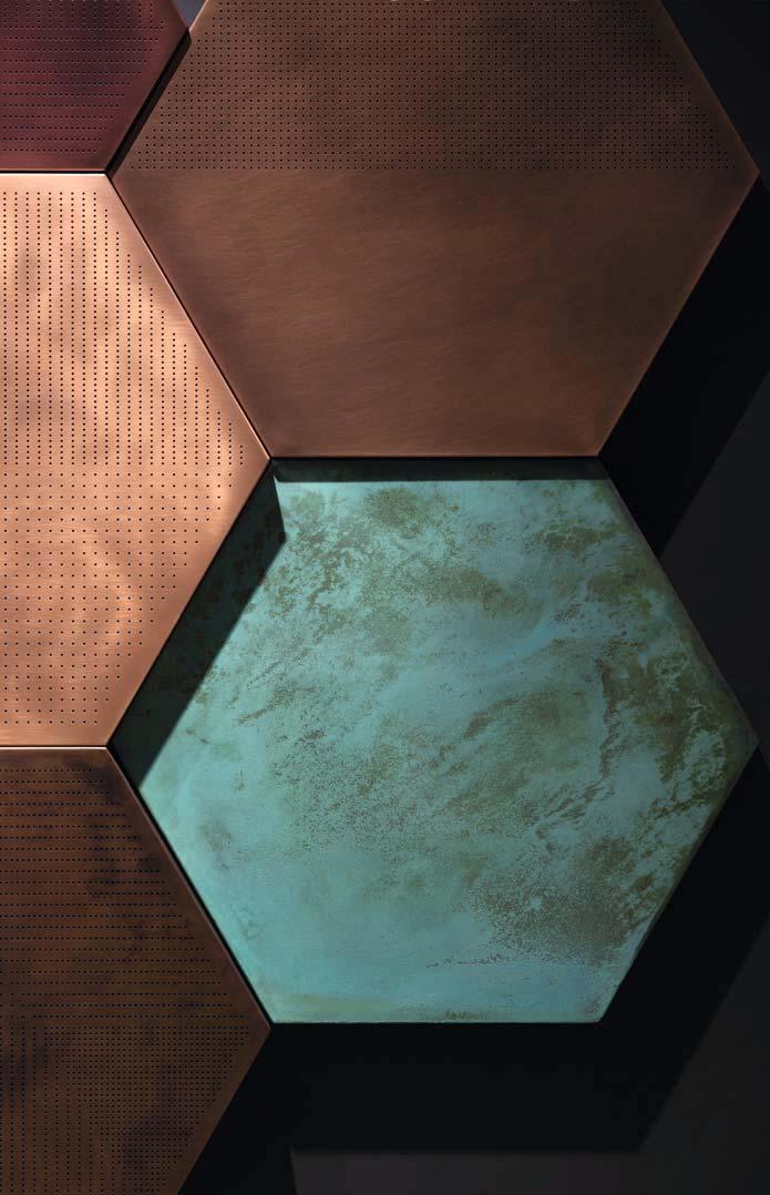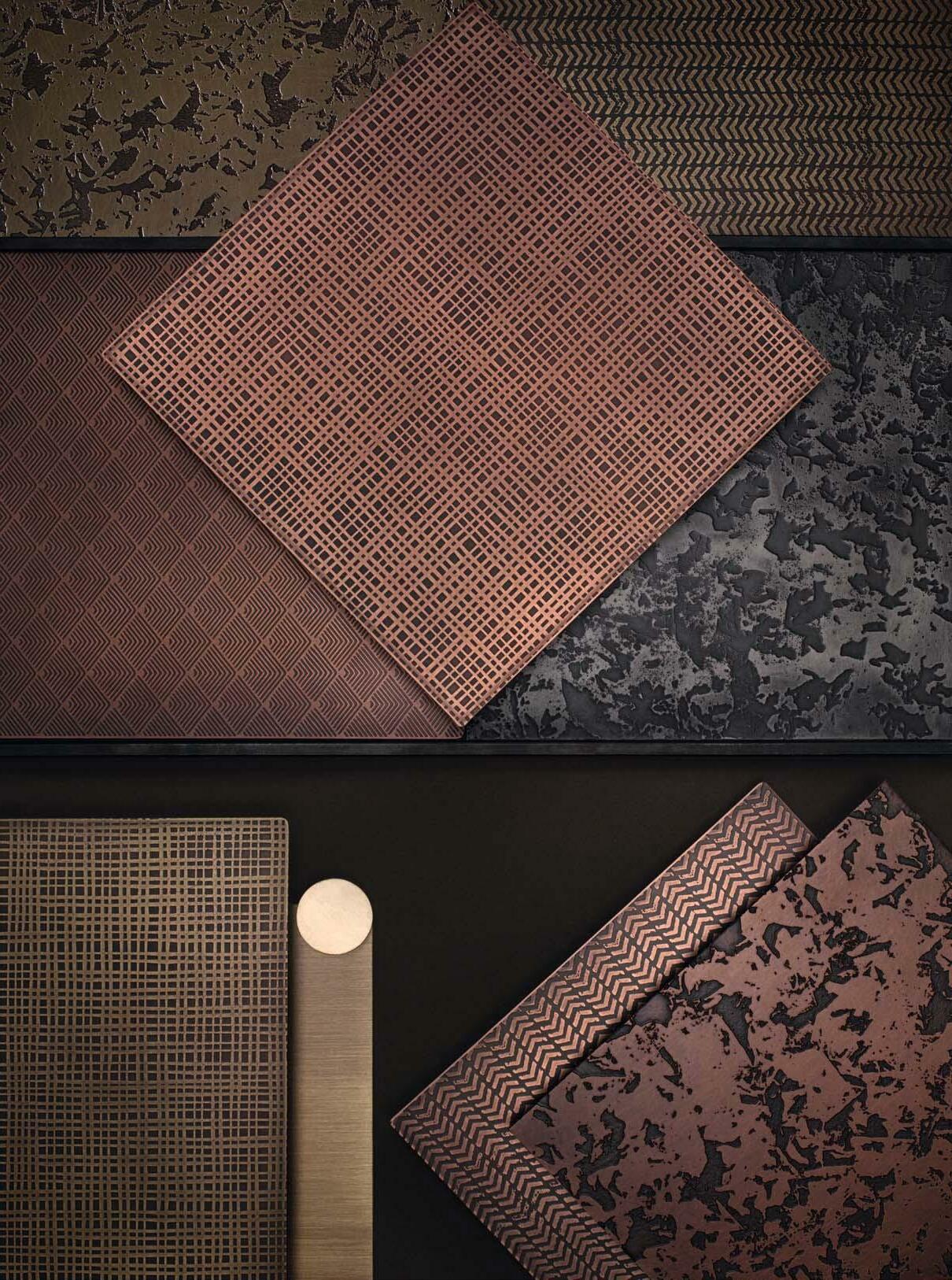 Ossidazioni, intarsi, incisioni, erosioni: sono molti gli universi possibili per un materiale metamorfico, destinato ad accogliere la patina del tempo che la mano dell’uomo può fermare o accelerare, a seconda dell’effetto di superficie ricercato. Il metallo come rivestimento offre una seconda pelle all’architettura, dando vita ad una palette ricchissima di toni cangianti, ossidazioni, colori profondi. Una pelle che assume una speciale connotazione artistica, enfatizzata dall’eleganza geometrica di pattern rigorosi, resi vibranti dalle continue variazioni di spessori e forme. Le superfici De Castelli introducono una dimensione decorativa del tutto inedita, che rifugge l’artificio ed esalta la natura più profonda del materiale nel suo valore estetico e simbolico.