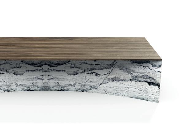 Mantica Table design by Elena Pancaldi Grey-stained Canaletto Walnut + White Camouflage Marble