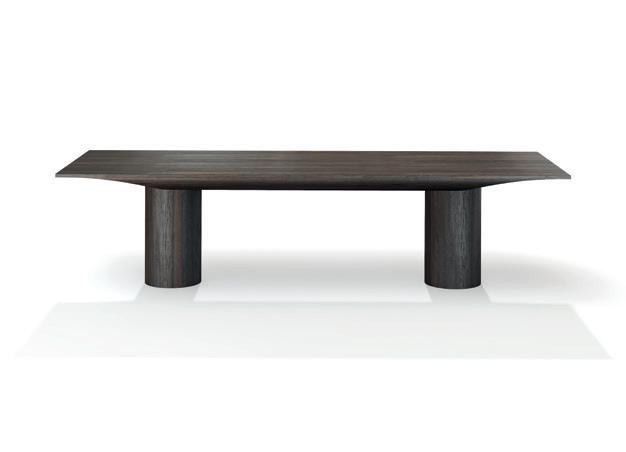 The table Menhir solves the very strongly felt issue of the relationship between top and base, with a design of authentic taste. The rounded structure, bevelled on the bent side, meets the cove in the end parts, the whole resting on two pillars. The technological component together with the manual skill and the know-how embrace the craftsmanship, giving rise to a sculptural table, elegant in all its parts. Displayed in brown-stained Limba.