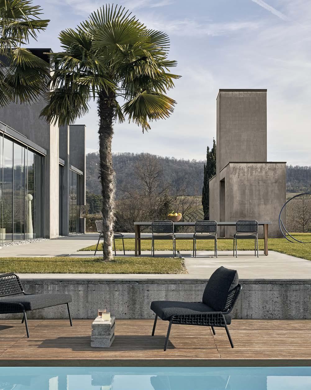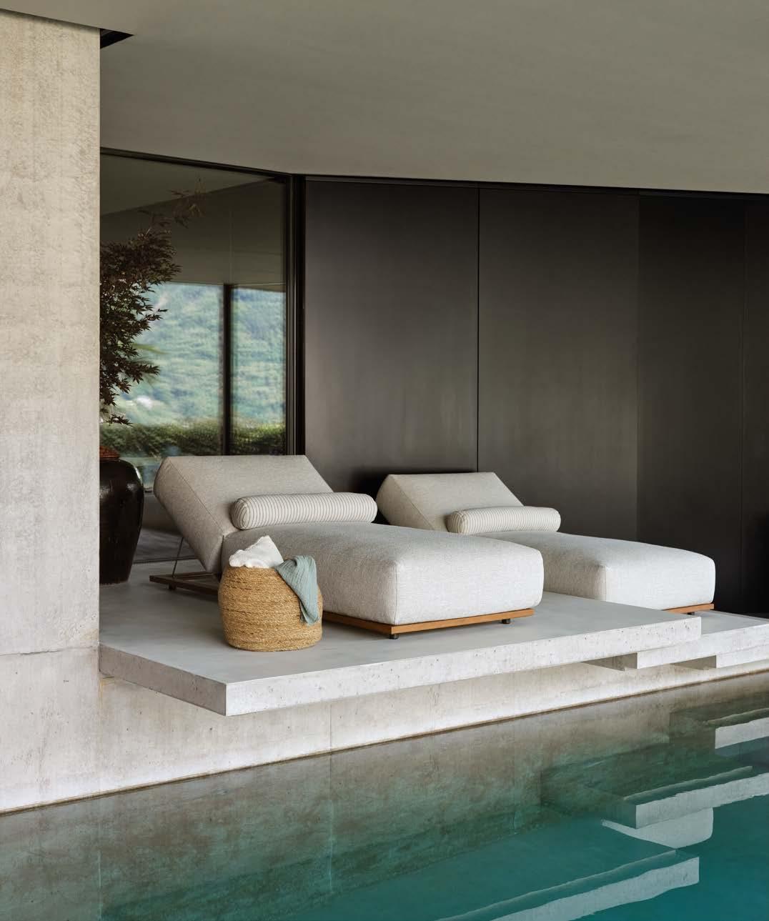 A panorama which inspires the desire to go outside, to enjoy nature admiring the lake view and looking at the sky. A home perfectly merged with the landscape and subject to the changing shades of light, thus expressing all its mimetic soul. Skilfully matched, the furnishing allows microcosms of imagination thanks to the selection of fabrics and materials inspired by the surrounding landscape, giving life to multi- sensorial compositions. That’s how the lounge bed in aluminium and rope is placed directly in the swimming pool to fully enjoy the contact with water and the iroko modular sofa, combined with the concrete low table, upstages the indoor living spaces.