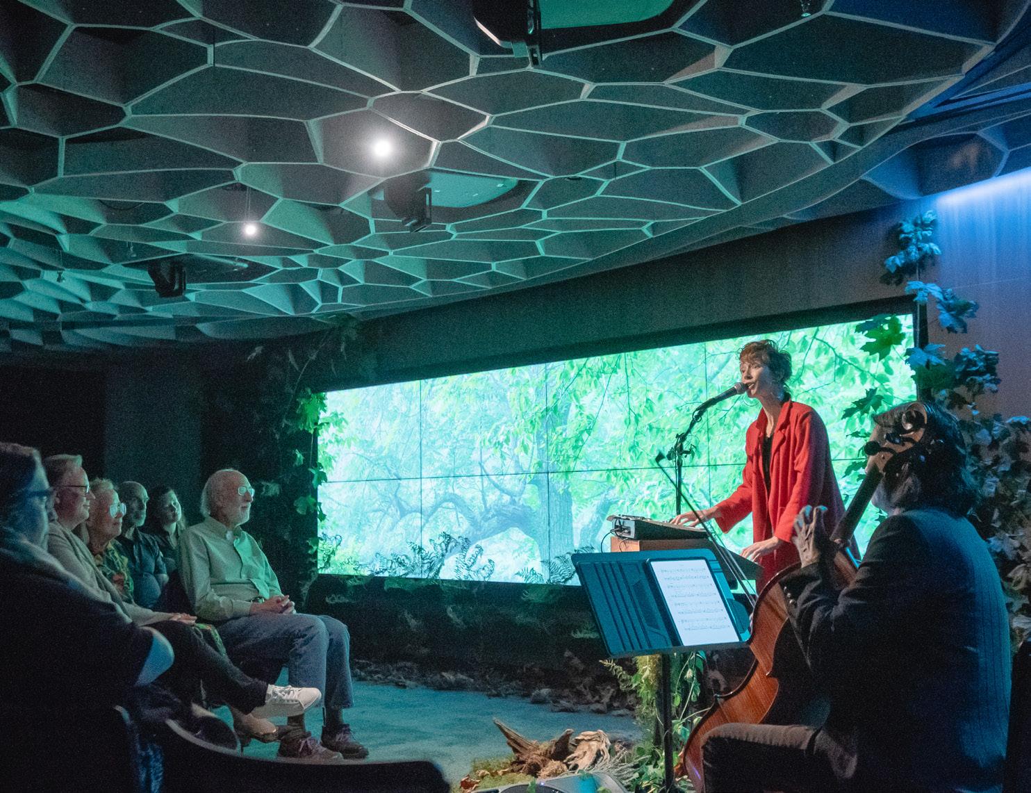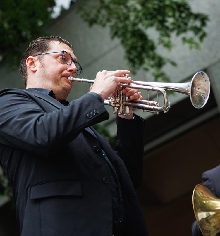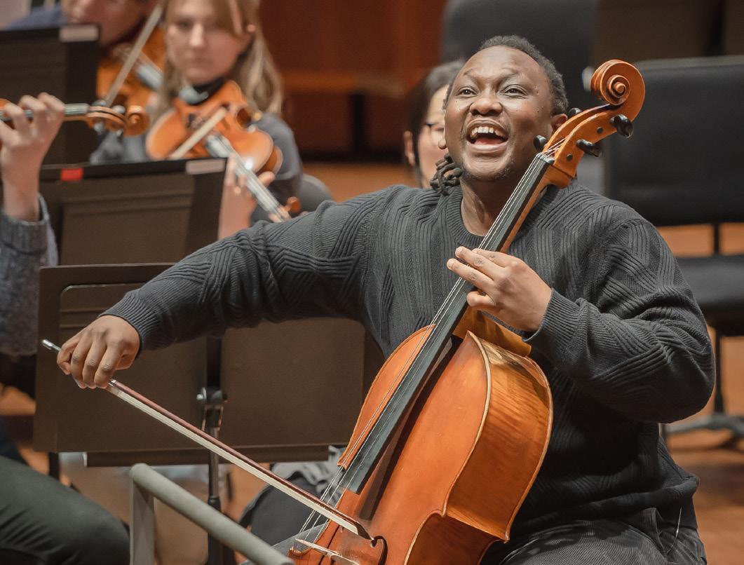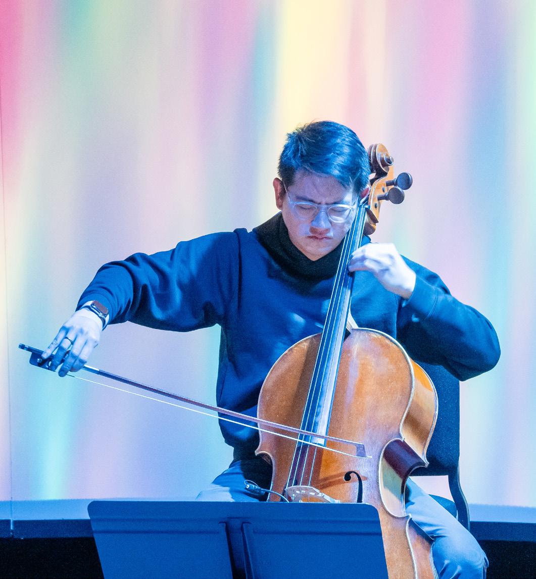 1 Elderflora, composed and performed by Majel Connery and featuring cellist Felix Fan with photography by Noah Kalina, opened the 2024/2025 Octave 9 Series. 2 Practicing during an Open Rehearsal, cellist Abel Selaocoe creates a unique sound and a dynamic concert experience by incorporating traditional throat singing into his work. 3 At the Opening Night Gala, Seattle Symphony Horn John Turman, Associate Principal Trumpet Alexander White, Percussion & Associate Principal Timpani Matthew Decker and Principal Tuba John DiCesare performed an arrangement of Bart Howard’s “Fly Me to the Moon.” 4 Assistant Principal Cello Nathan Chan performed Veiled by Niloufar Nourbakhsh in Octave 9: Raisbeck Music Center. 2