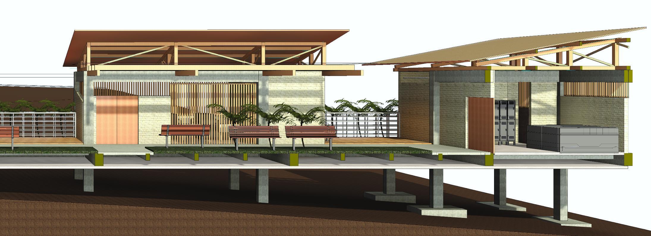 El proyecto fue elevado del terreno mediante pilotes debido a las condiciones de humedad y presencia de animales en la zona De igual manera, las cubiertas están inclinadas buscando la circulación y expulsión del aire para una ventilación cruzada constante entre módulos y a través de los patios interiores De esta manera, el proyecto hace uso de las brisas del suroeste y mantiene fresco las zonas de permanencia privadas y comunes,