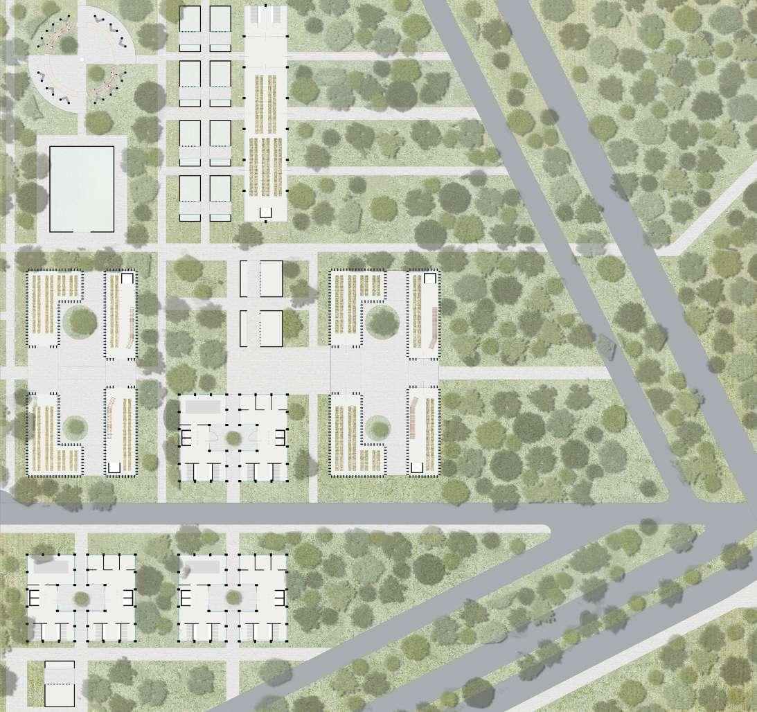 El dispositivo de distrito agrícola es una pieza que está ubicada dentro del anillo perimetral verde propues to para el territorio, este, que se compone principalmente por 3 tipologías diferentes que responden a varias necesi dades del sector las cuales son equipamientos, residencias e invernaderos, que se disponen en una retícu la programática la cual se organiza en manzanas las cuales contienen las diferentes tipologías junto con servicios complementarios y jardines, creando una forma de exposición agrícola y de producción nacional de alimentos.