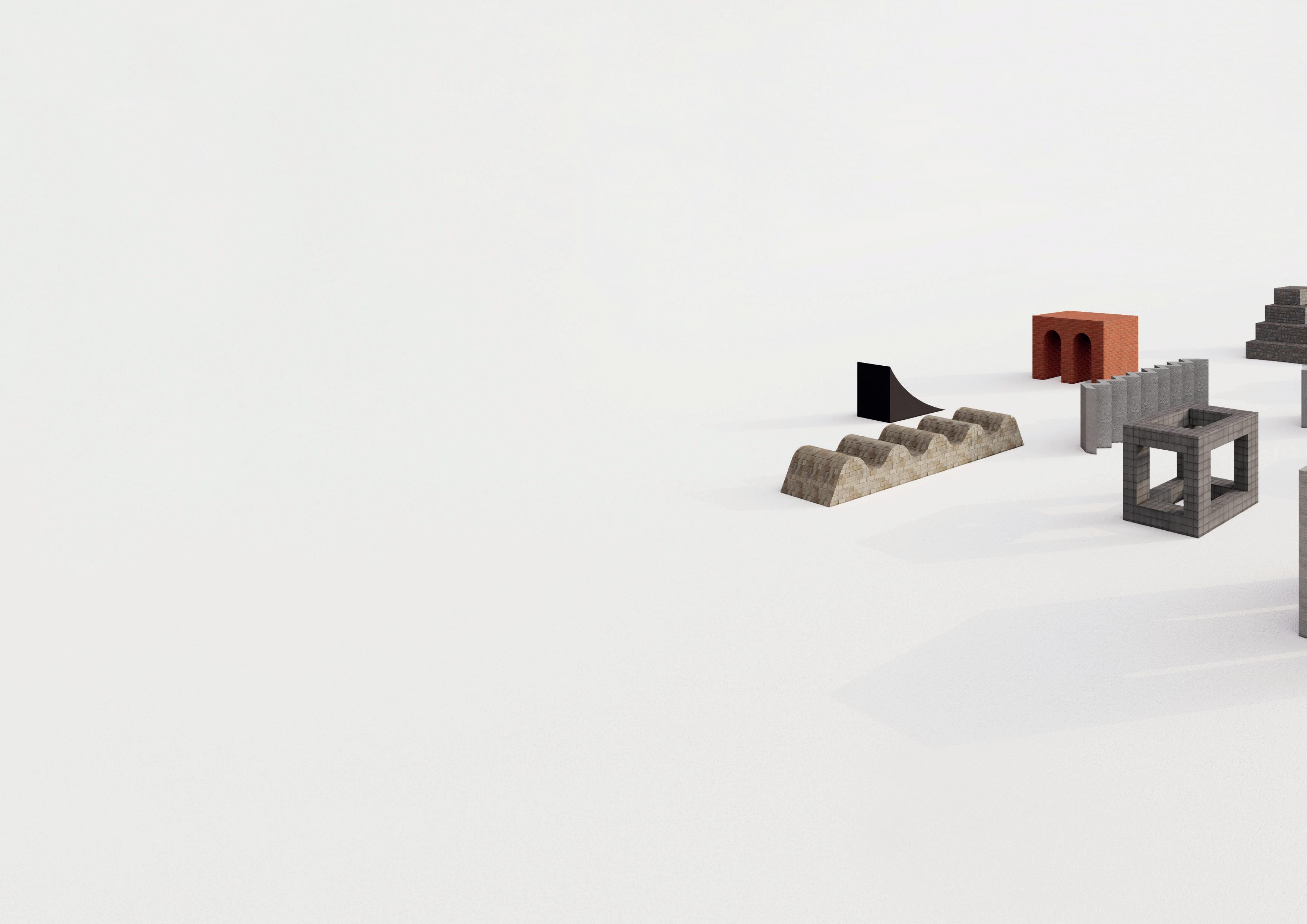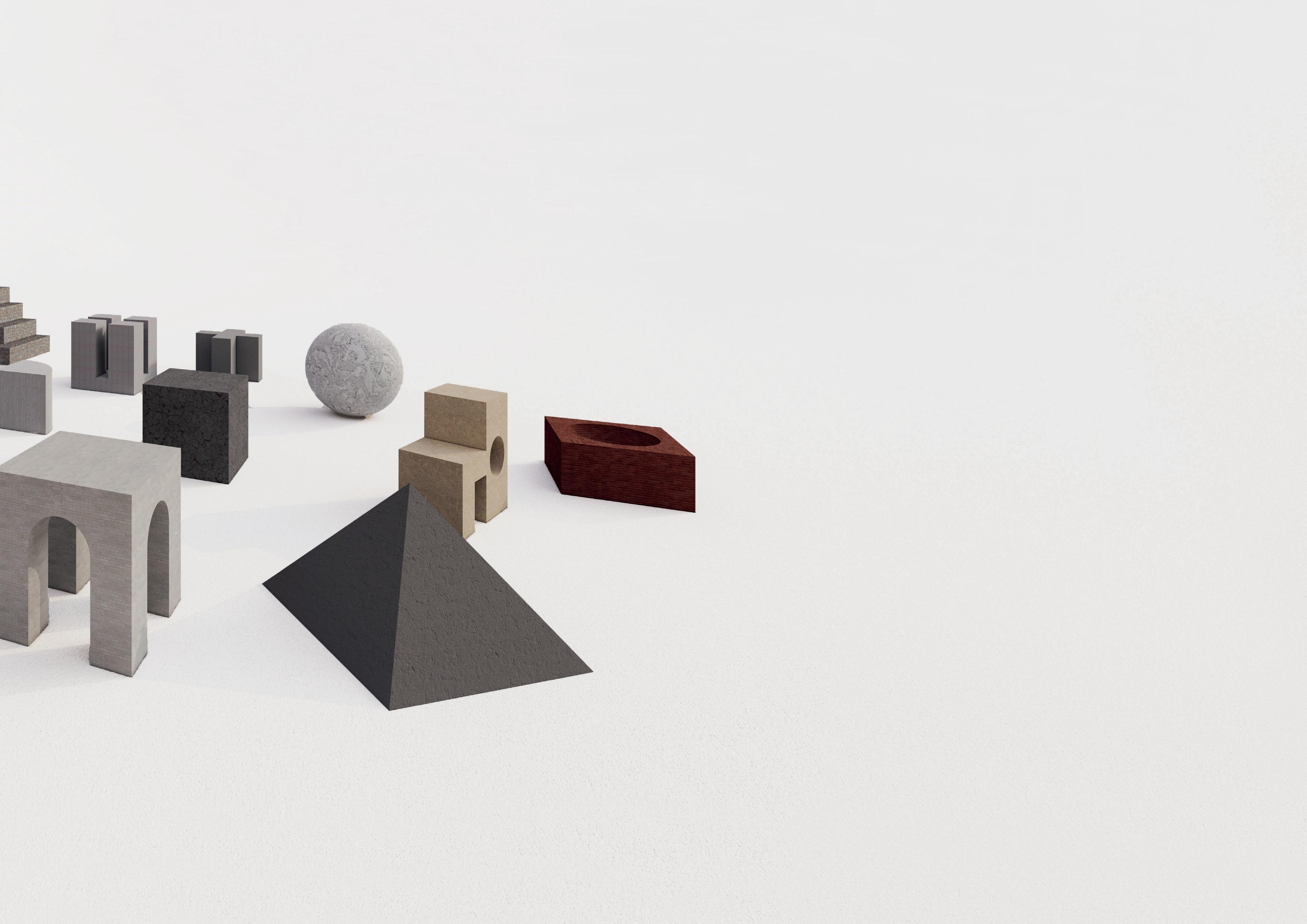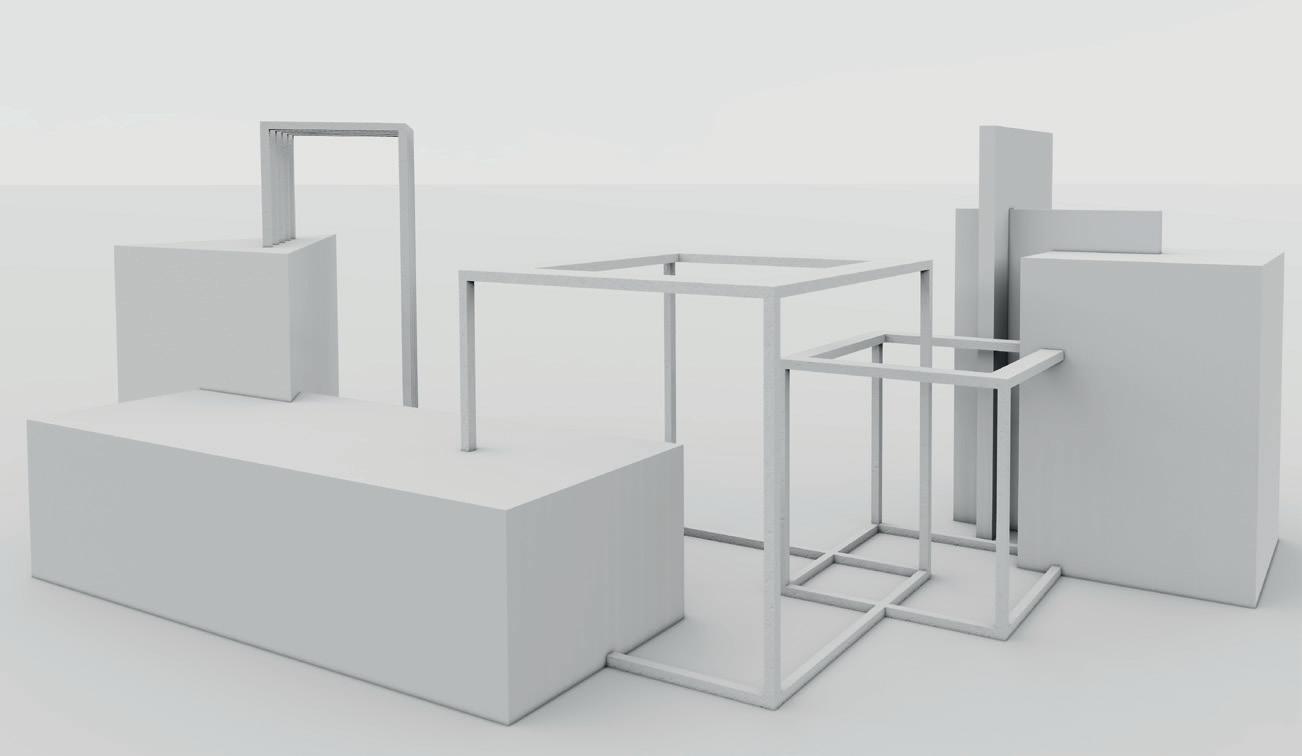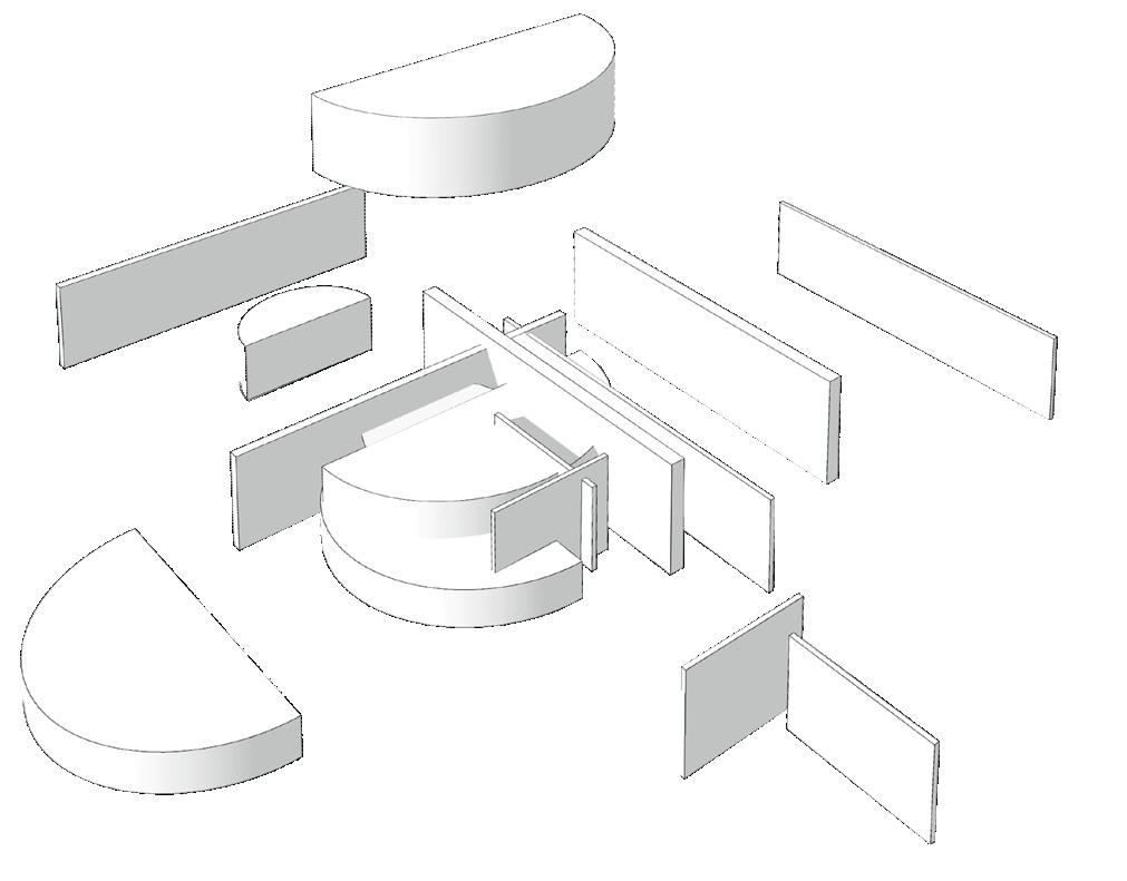 La composición se generó a partir de dos ejes transversales que ordenan y enmarcan a las demás geometrías, en esta composición solo se usaron círculos y líneas como base bidimensional y posteriormente se alzaron para dar tridimensión.